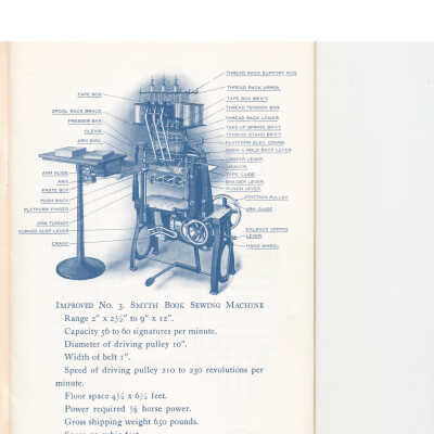 Smyth #3 sewing machine was the first production book sewing machine. Using a machine like this an operator could sew 2000 books per day as compared to a maximum of 200 books per day that could have been sewed by hand prior to the availability of the Smyth #3.