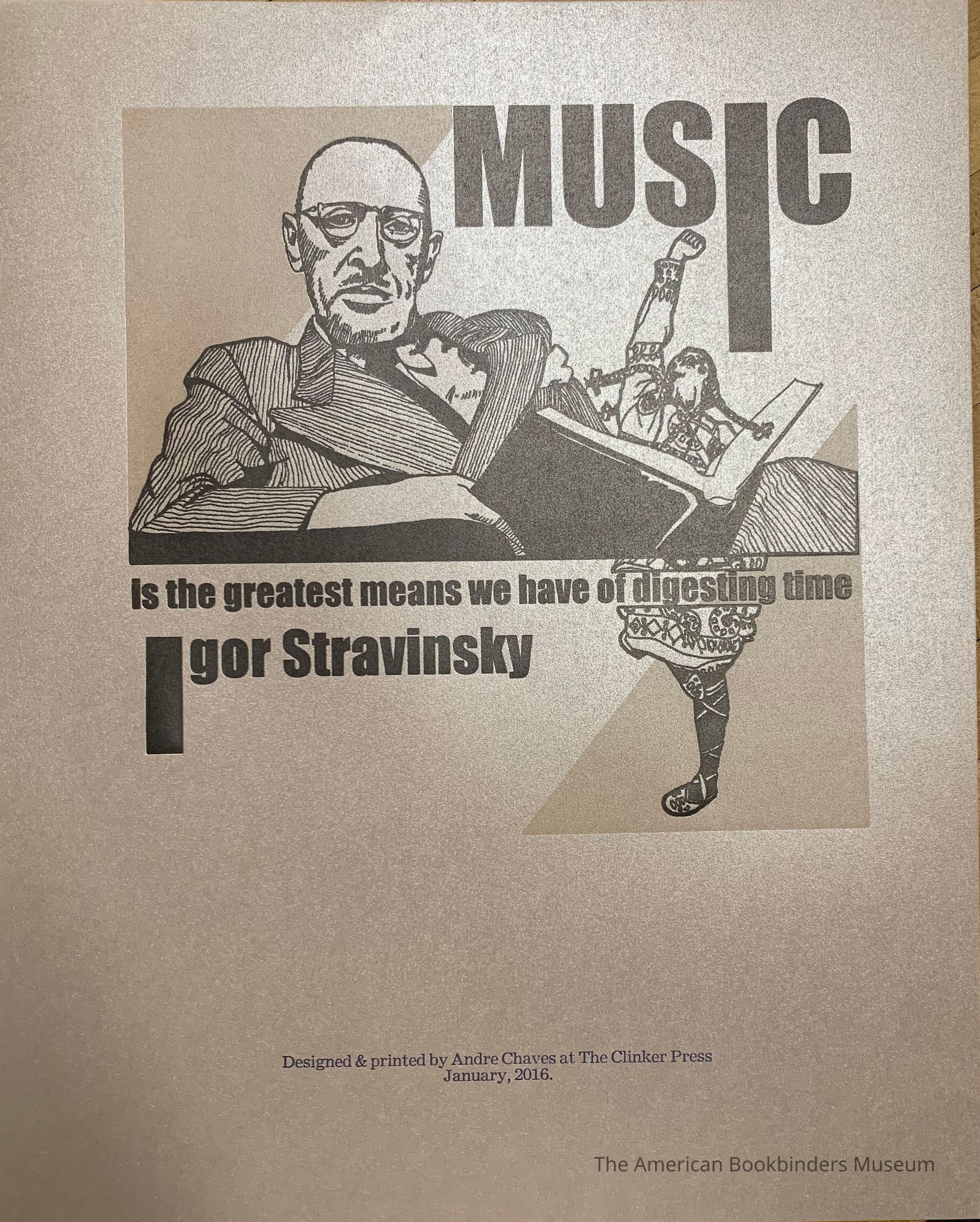 Quote and portrait of Stravinsky with book and dancer, printed in black on tan shiny paper.Collection