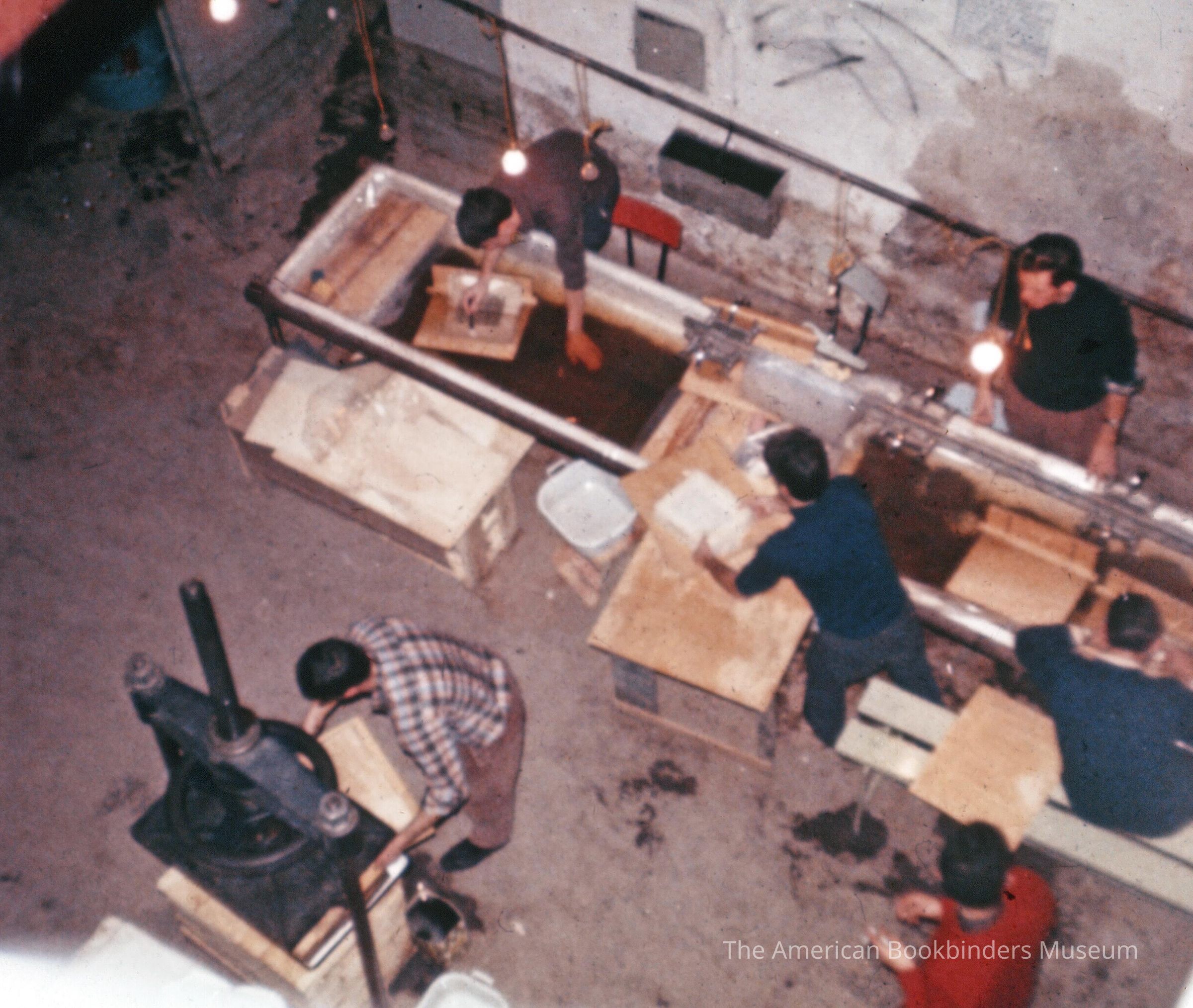 Scan of a slide. Four conservators are washing sheets from books. A with is at the screw press to wring out the pages.Photograph Details