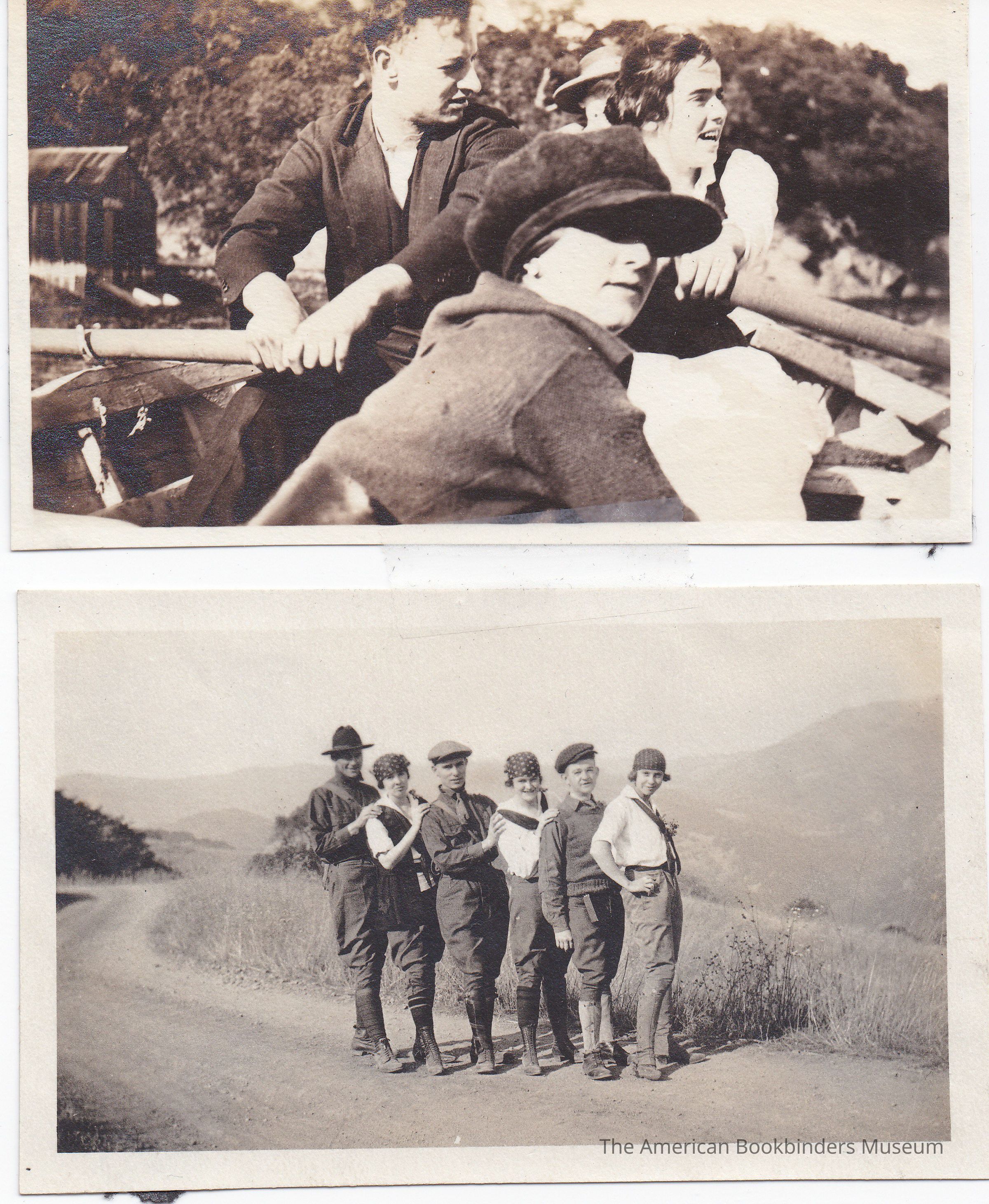 Two black and white photos, connected by tape. The top is Patri and others rowing. The lower is Patri and 5 others standing in a line, where Patri is the second from the left.Photograph Details