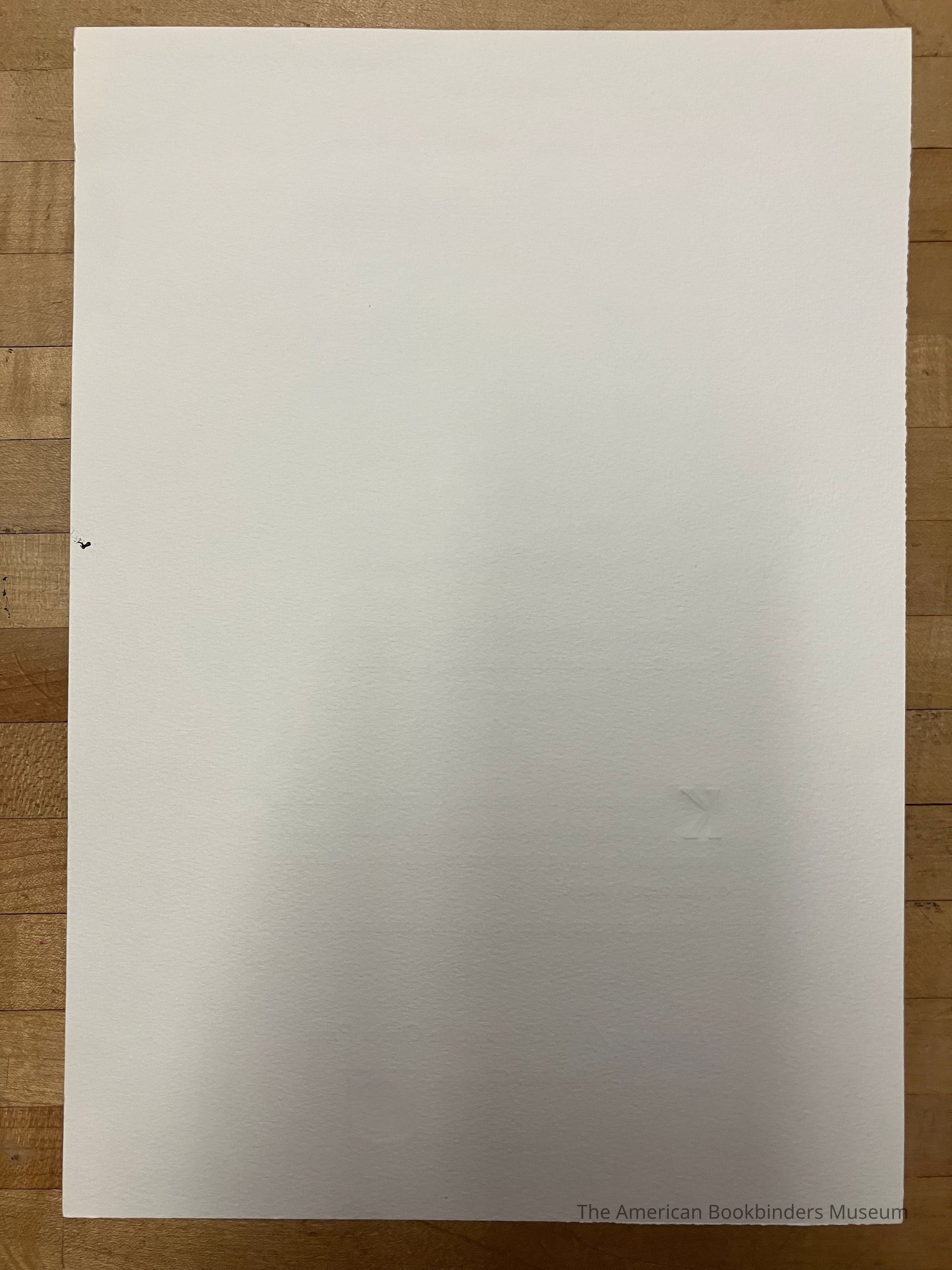 Illustration from 'Description of Haarlem', S. Ampzing, 1628. Said illustration looks like a woodblock print, showing three figures: one holding inkwells (used for spreading ink on type before printing), one at the press, and another typesetting. Below is text, and below that is printing information. Drop cap letter is red, with the rest of the vegetal design in black.Publication Details