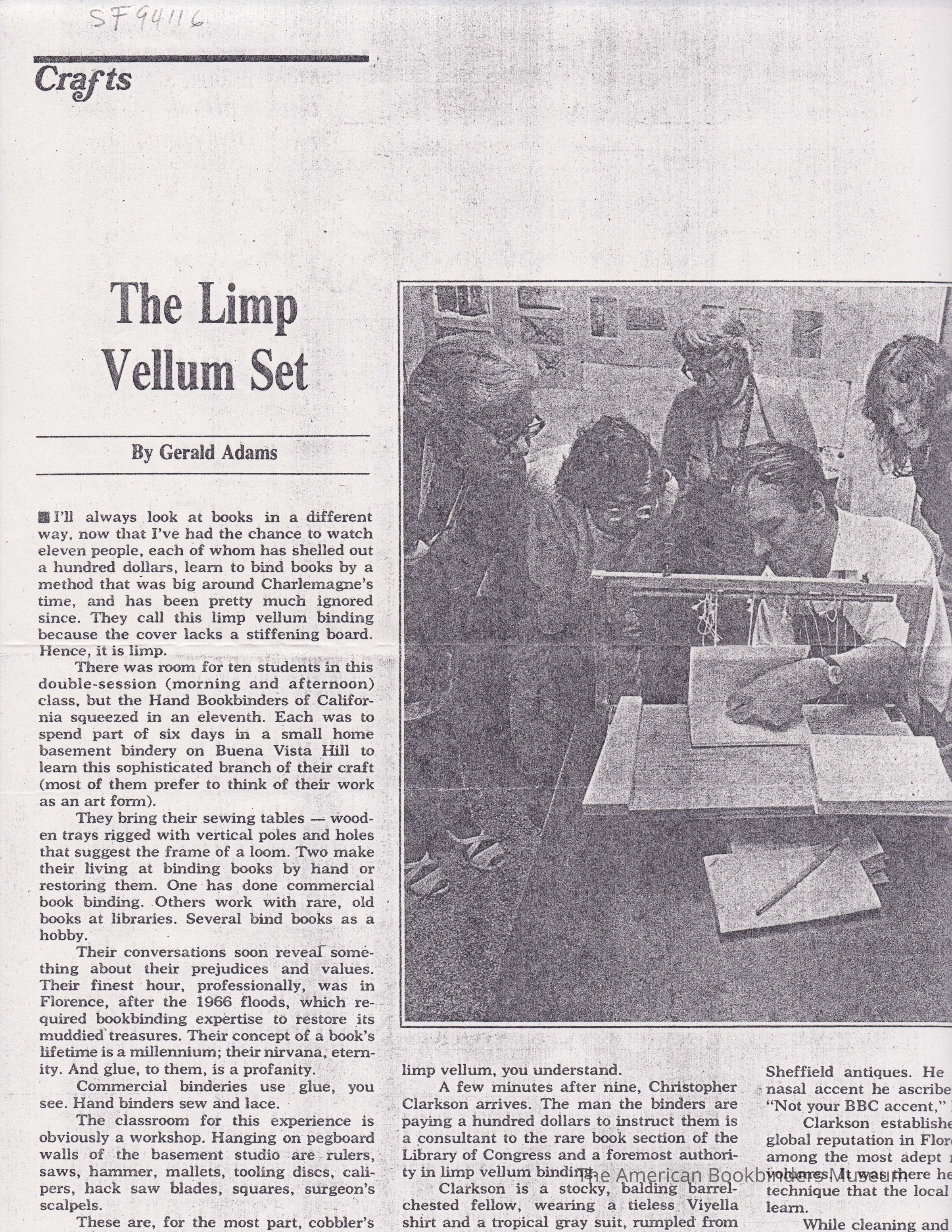 Photocopy of an article about Patri and Clarkson's classes on limp vellum binding.Collection