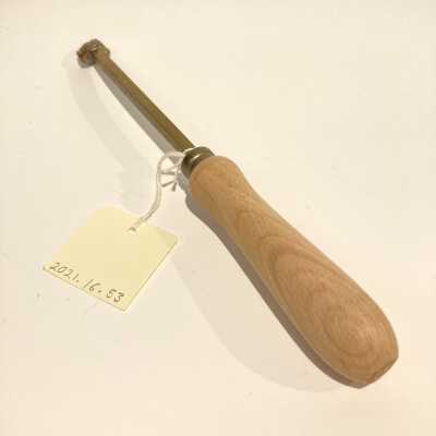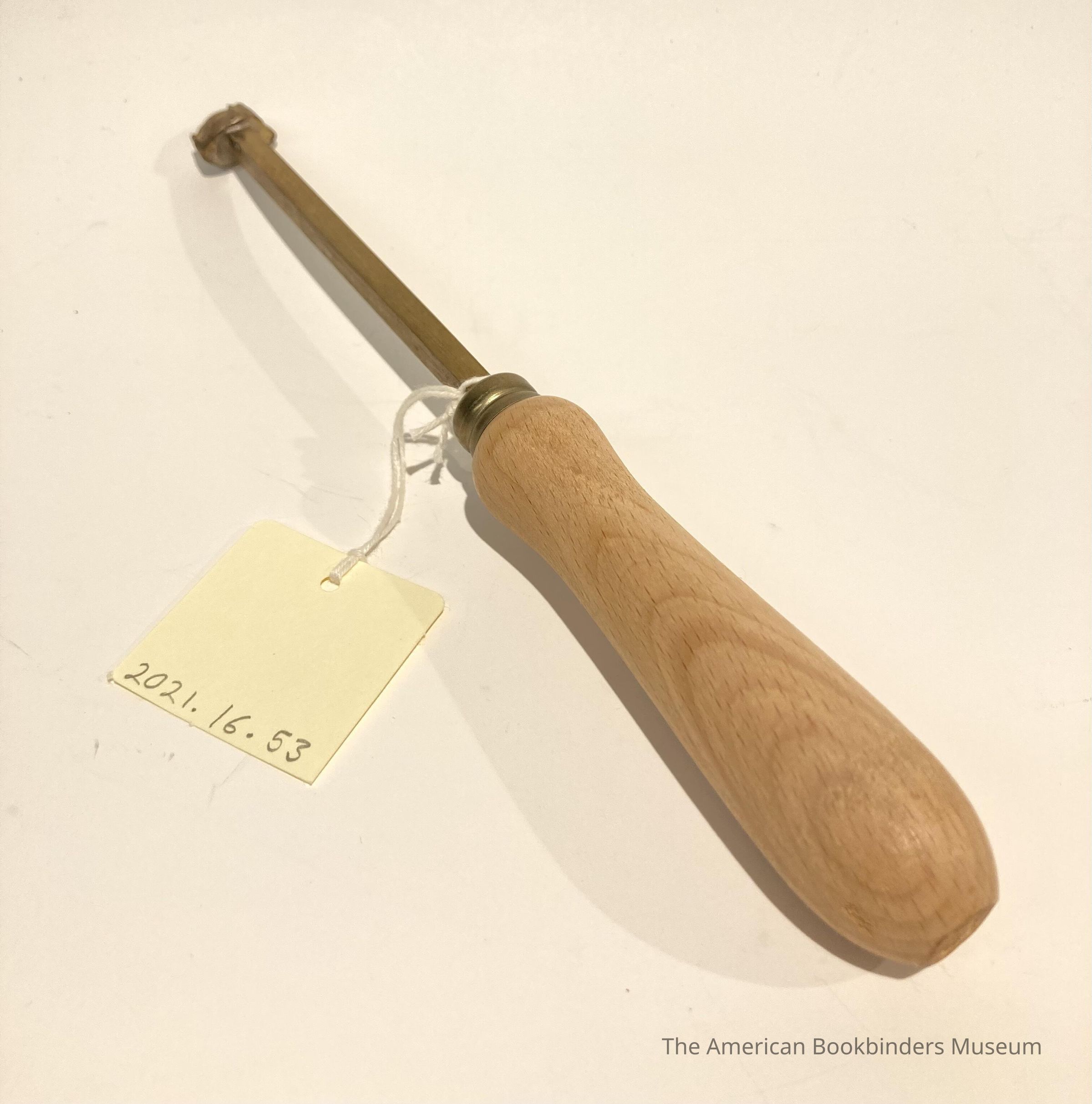 Hand stamp with wood handle. 2cm filigree design, many off-shooting lines and one leaf at the central swirl.