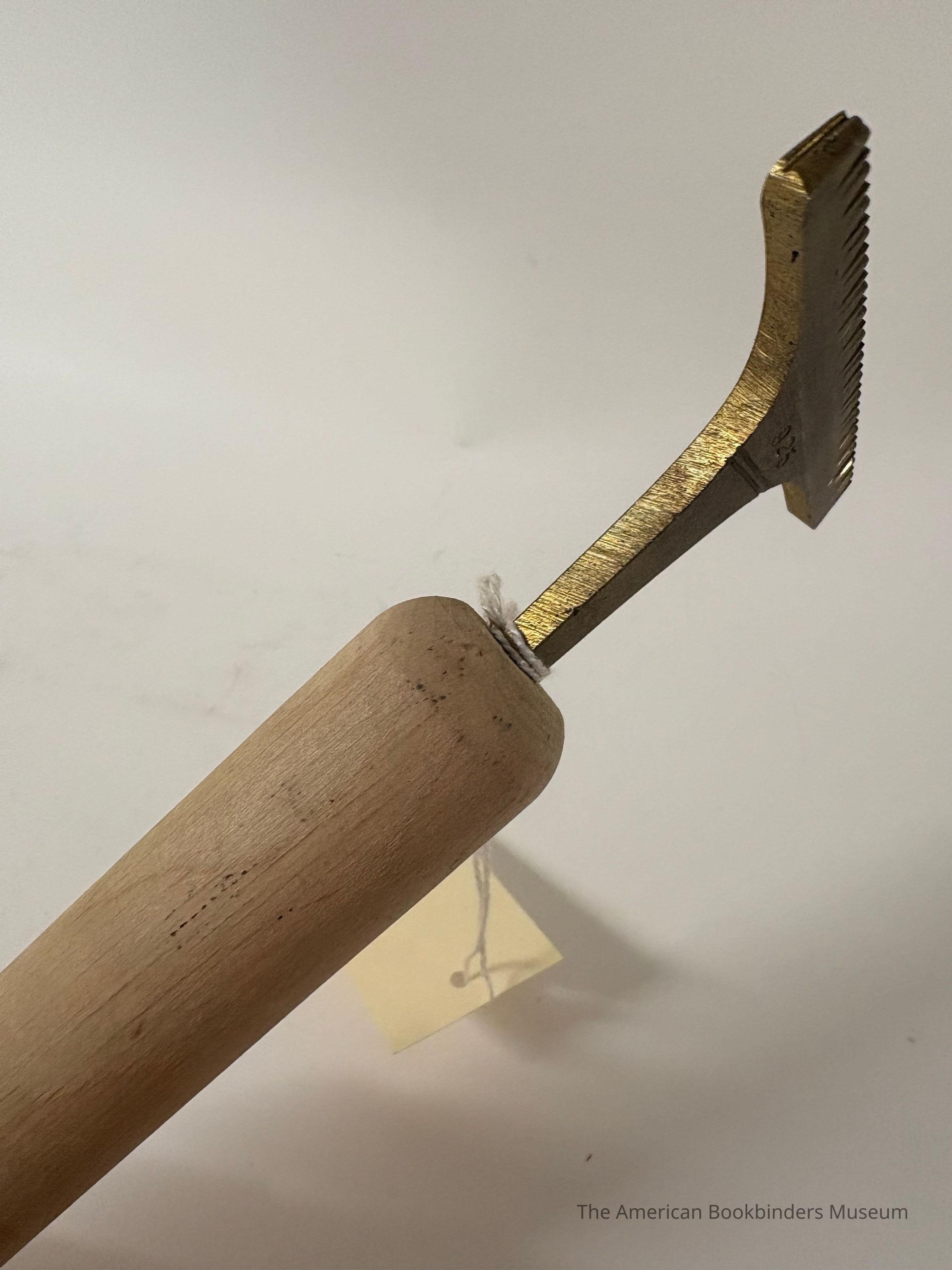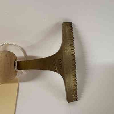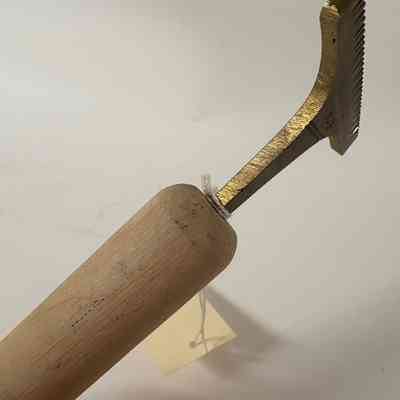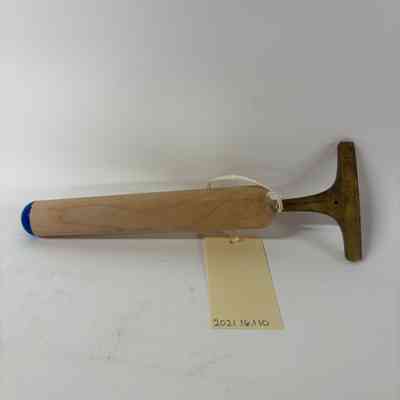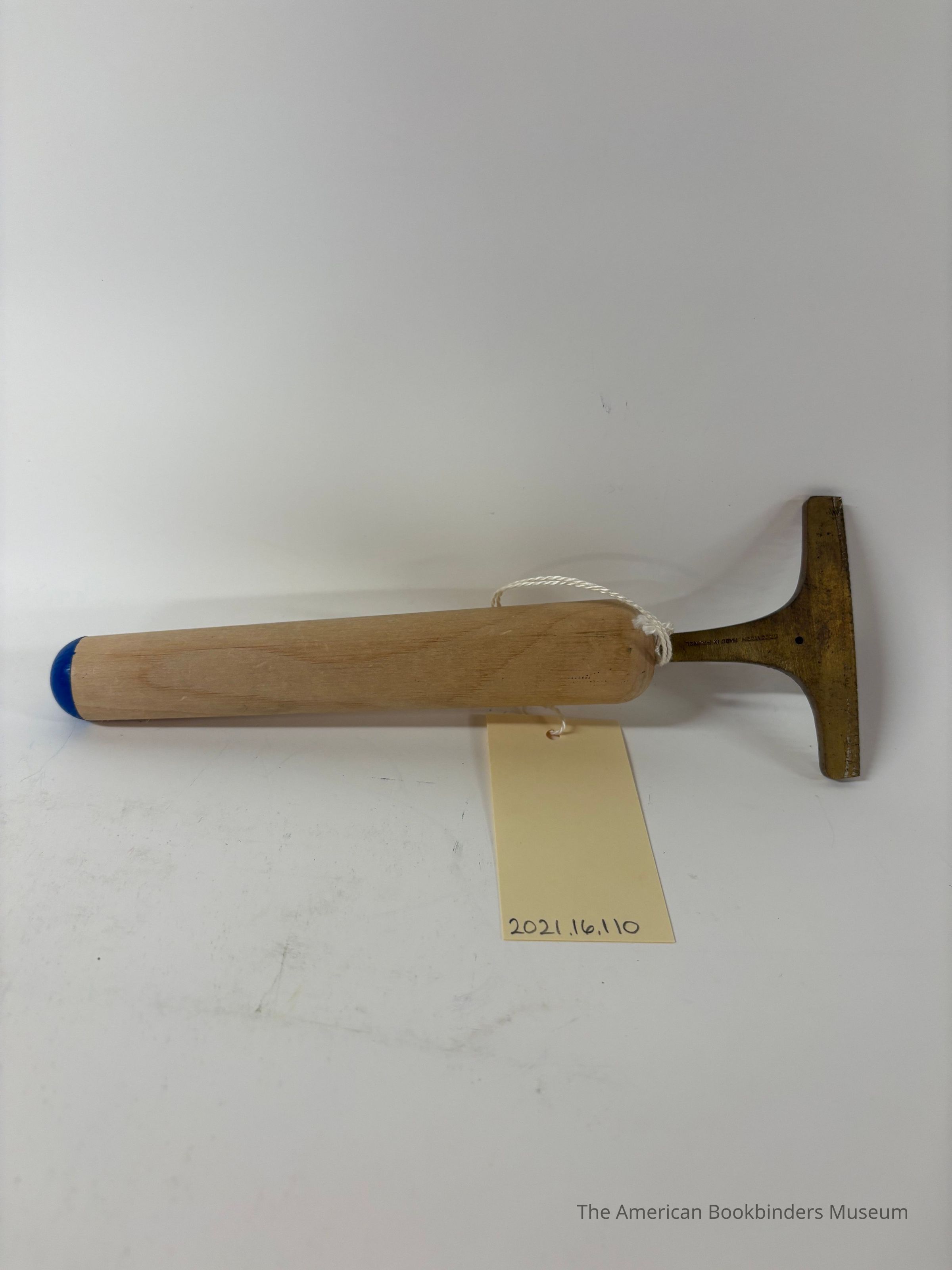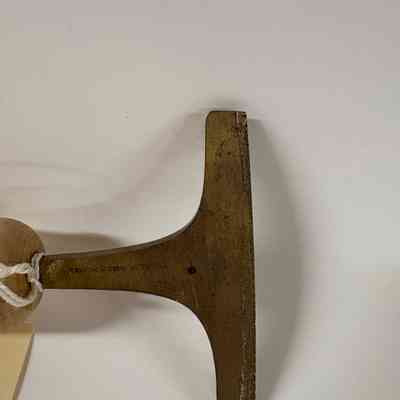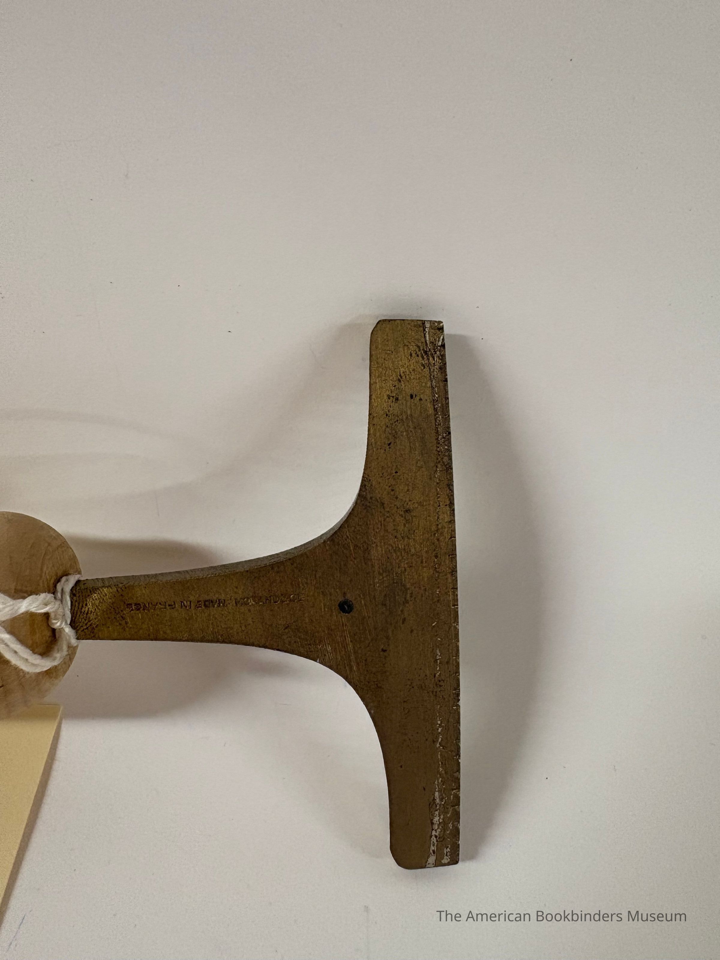 Decorative brass pallet of a 7.5 cm clover and sword motif on a wood handle. The end of the handle is painted blue. Manufacturer is Morand & CIE.Collection