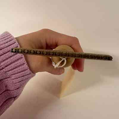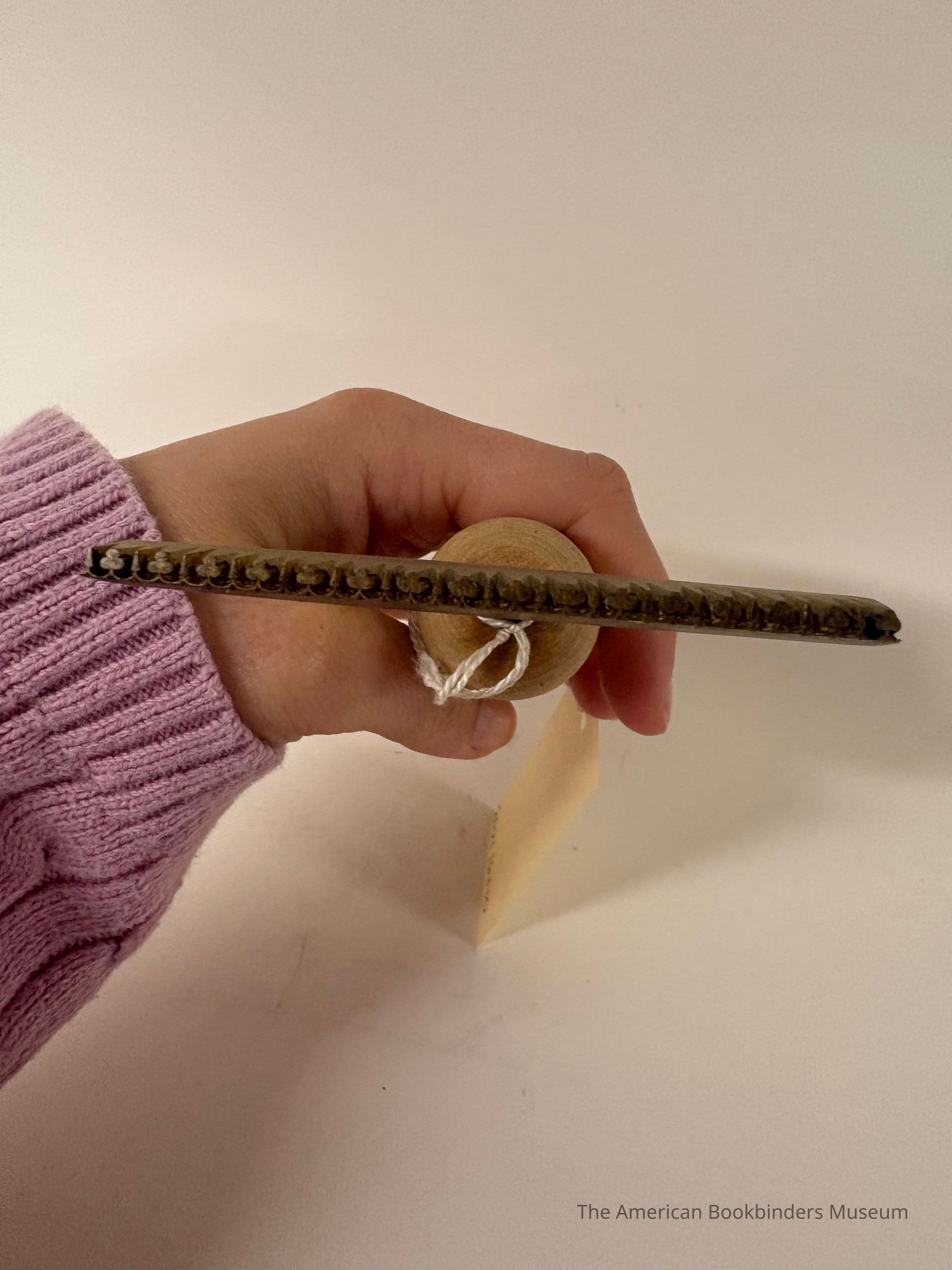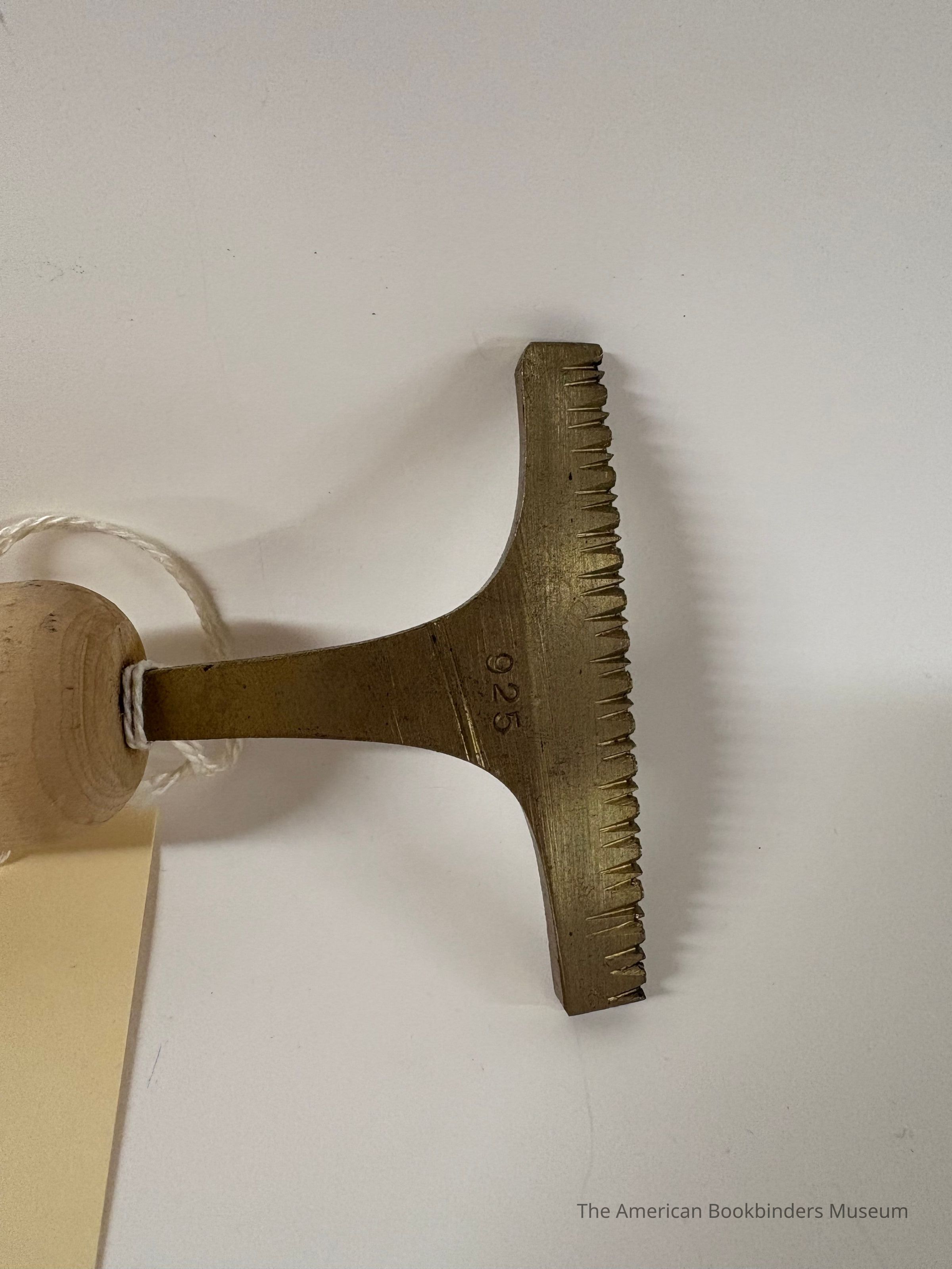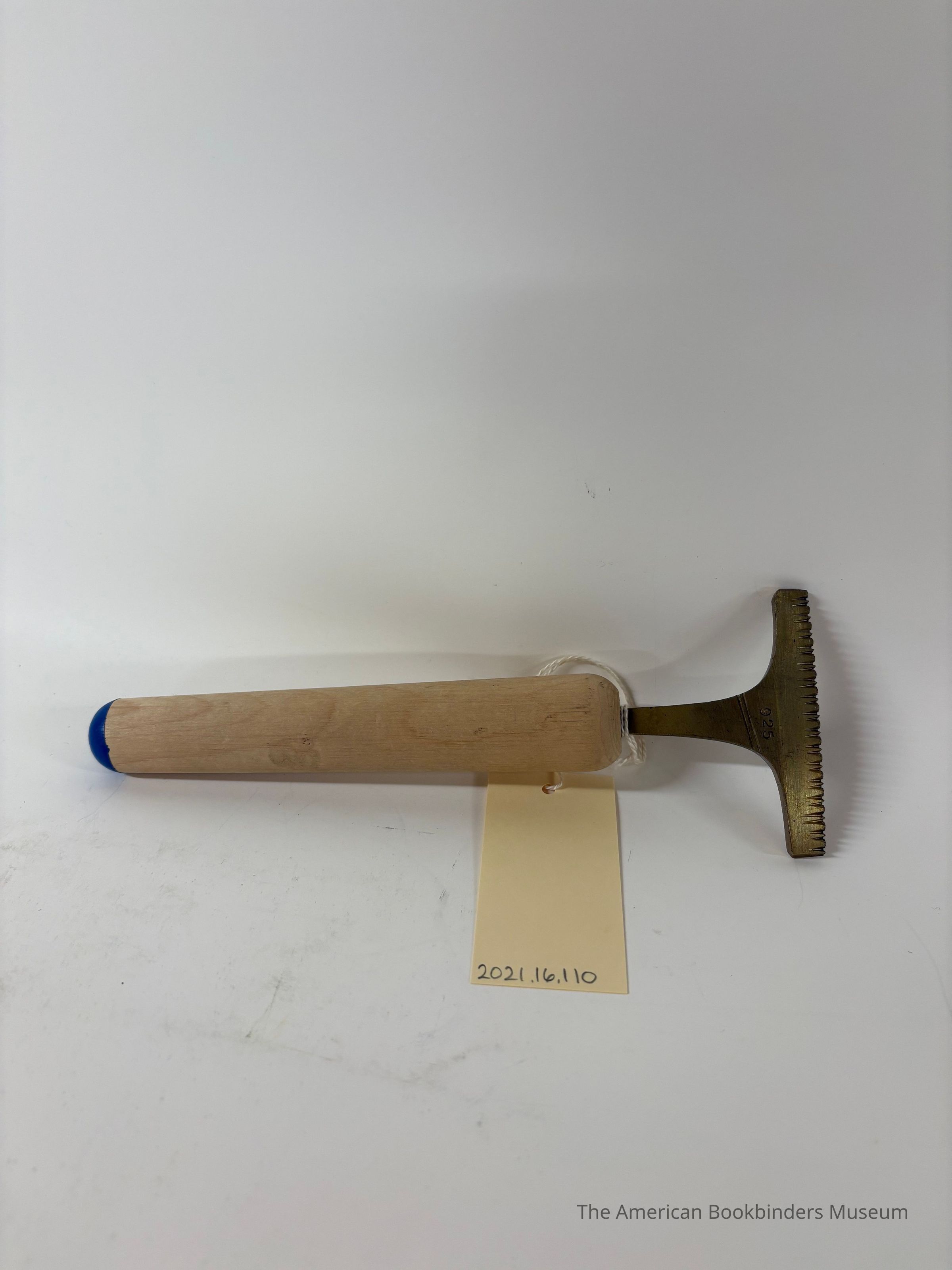 Decorative brass pallet of a 7.5 cm clover and sword motif on a wood handle. The end of the handle is painted blue. Manufacturer is Morand & CIE.Collection