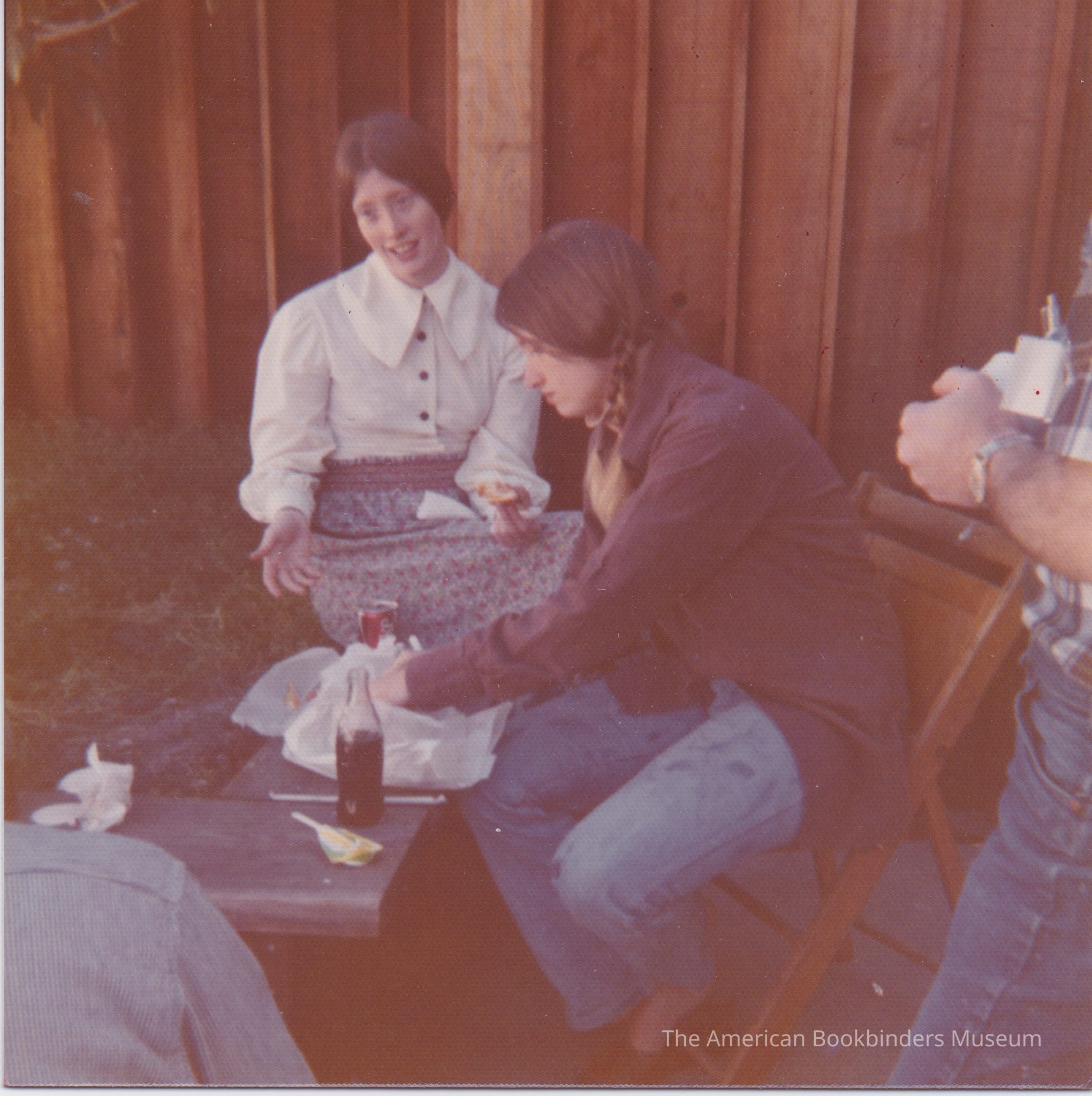 Photo of two women. One is talking to a figure out of frame, while the other is eating. A fence is visible behind the two. A third figure is partially visible on the right side of the imageCollection
