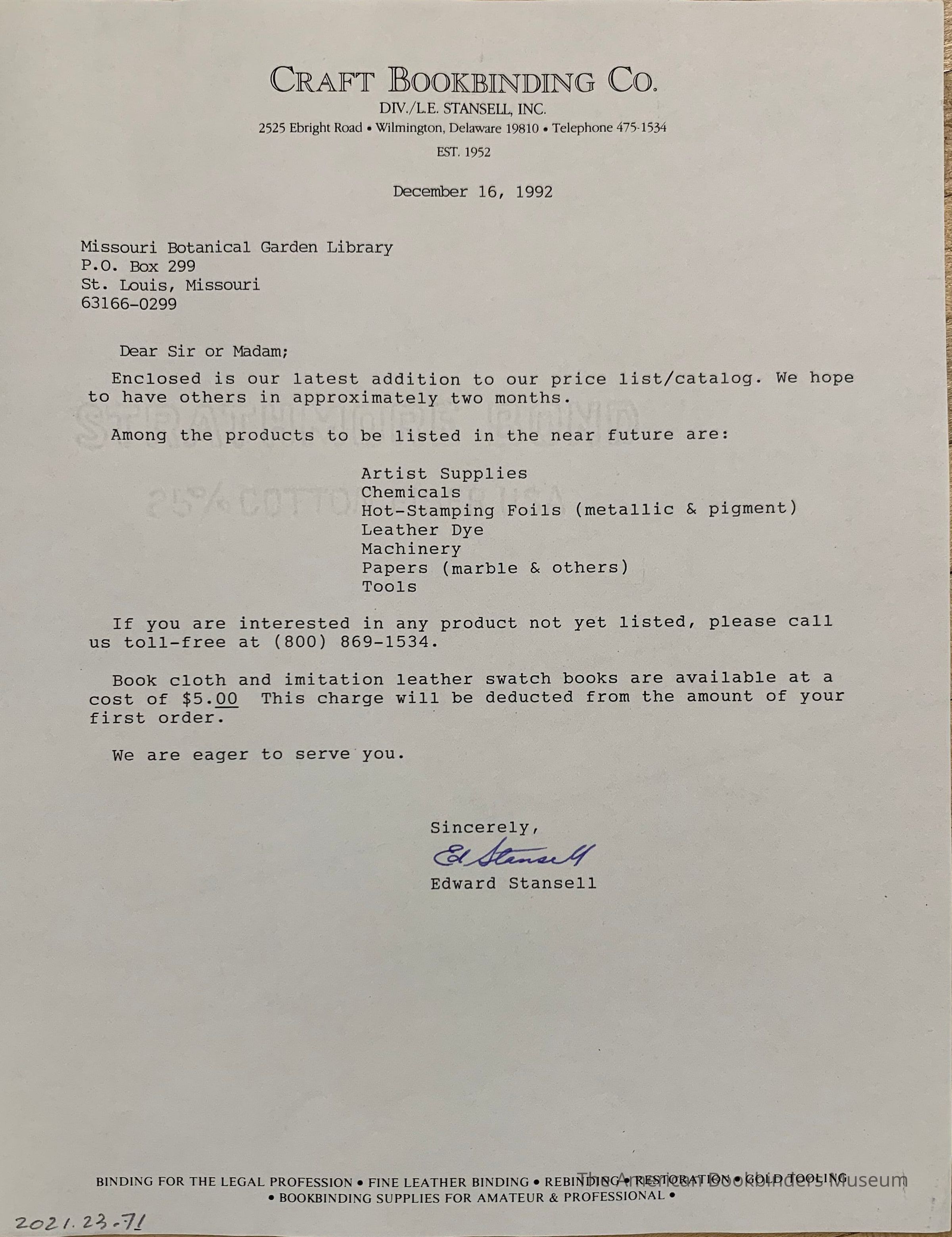 Letter and catalog of materials sent to Missouri Botanical Garden LIbrary, December 16, 1992.Collection
