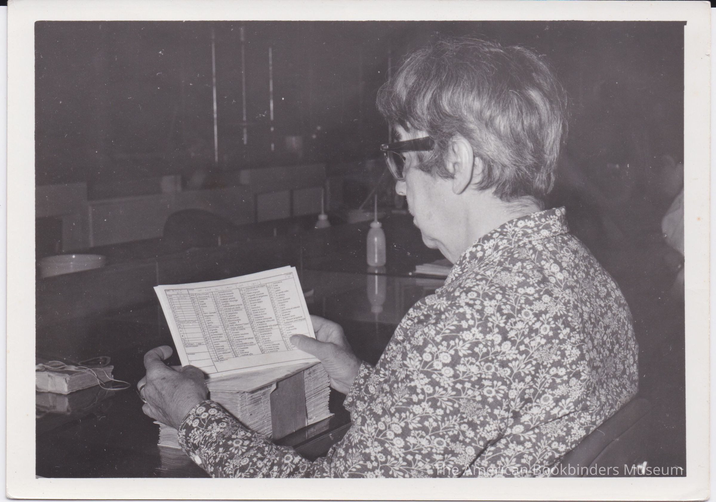 Black and white photo of Stella Patri sits at a workstation, holding a form in front of her. On the table is a large book without the cover.Photograph Details