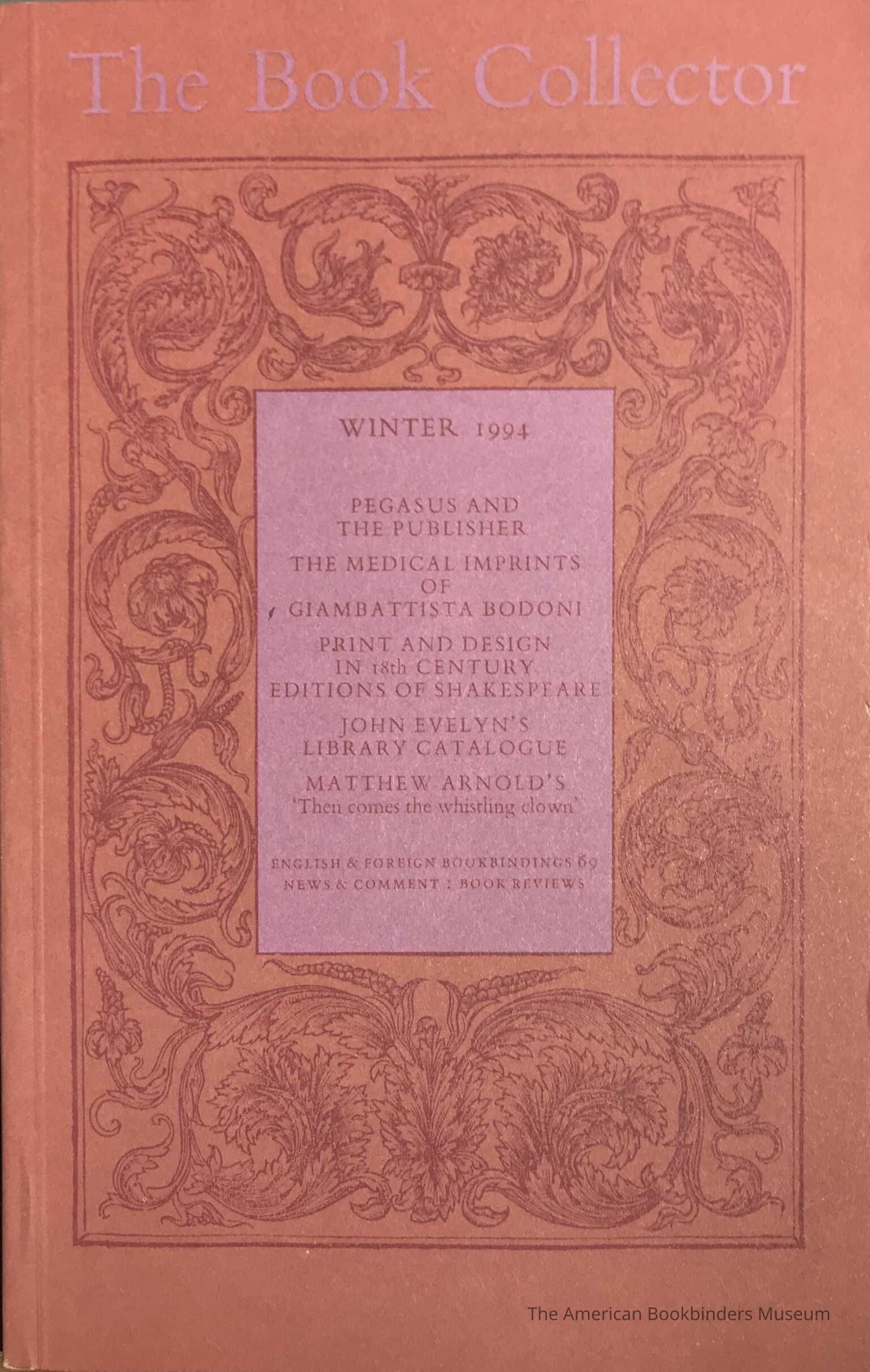 Pegasus and the Publisher / The Medical Imprints of Giambattista Bodoni, Saul Jarcho / Print and Design in Eighteenth-Century Editions of Shakespeare, Colin Franklin / John Evelyn's Library Catalogue, Guy de la Bedoyere / Matthew Arnold's 'Then comes the whistling clown', Roger L. Brooks / English and Foreign Bookbindings 69, David PearsonCollection