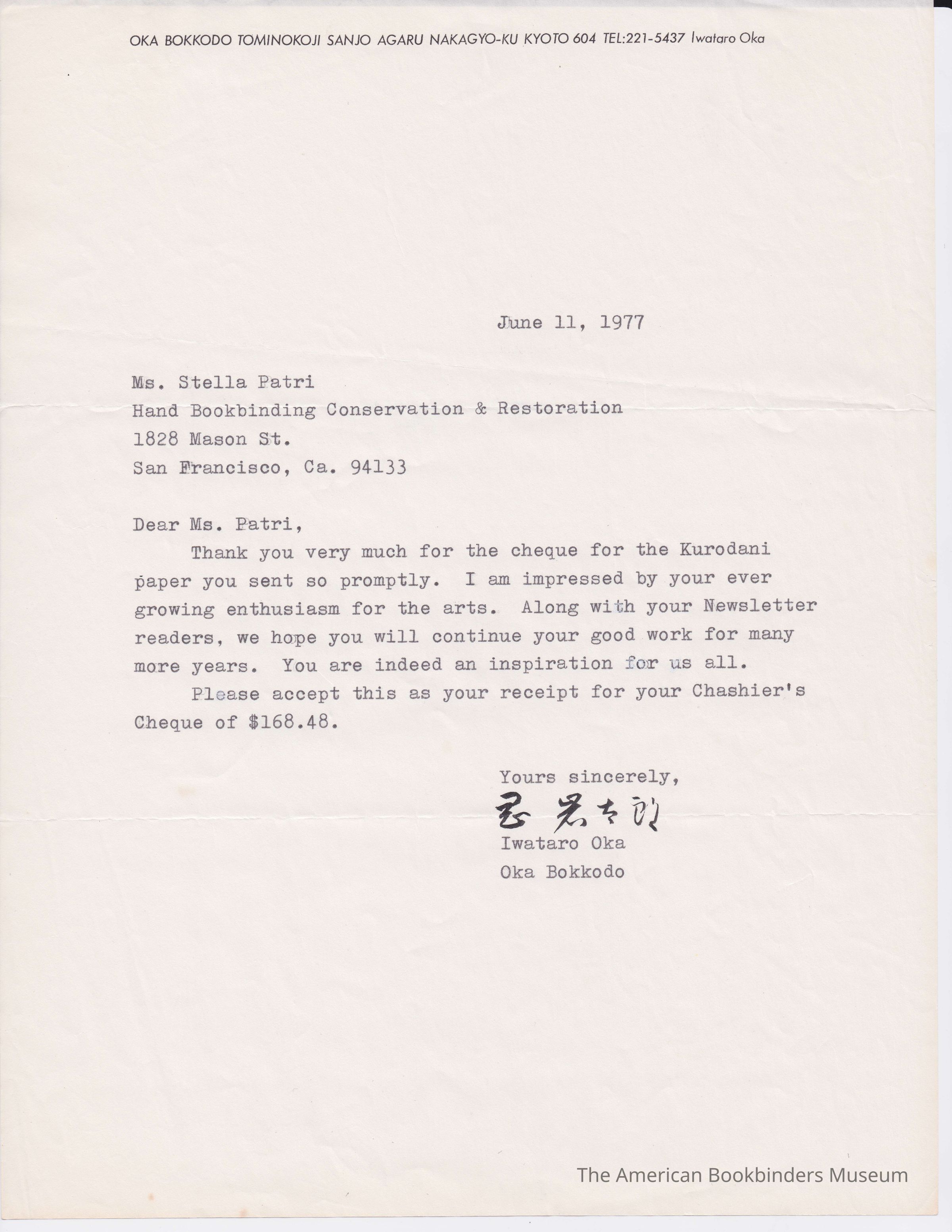 Iwataro Oka's letter notifying Patri he received the check dated June 6 (see 2023.9.9.x).