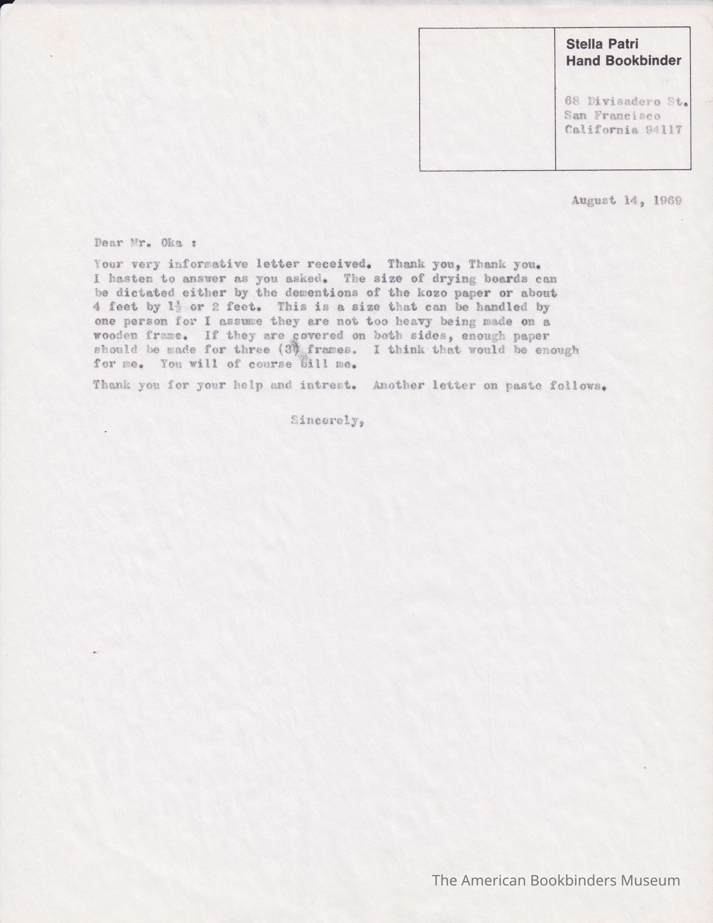 A letter from Patri to Oka, giving the dimensions of the drying boards.