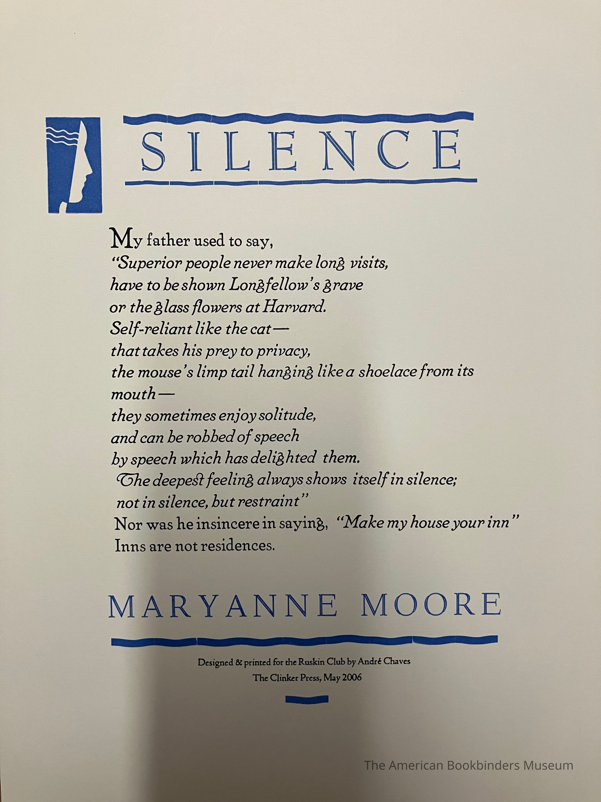 Title and author in blue, with the poem below in black. At the beginning and at the end are waves in the same blue. Printing information at the bottom.Collection