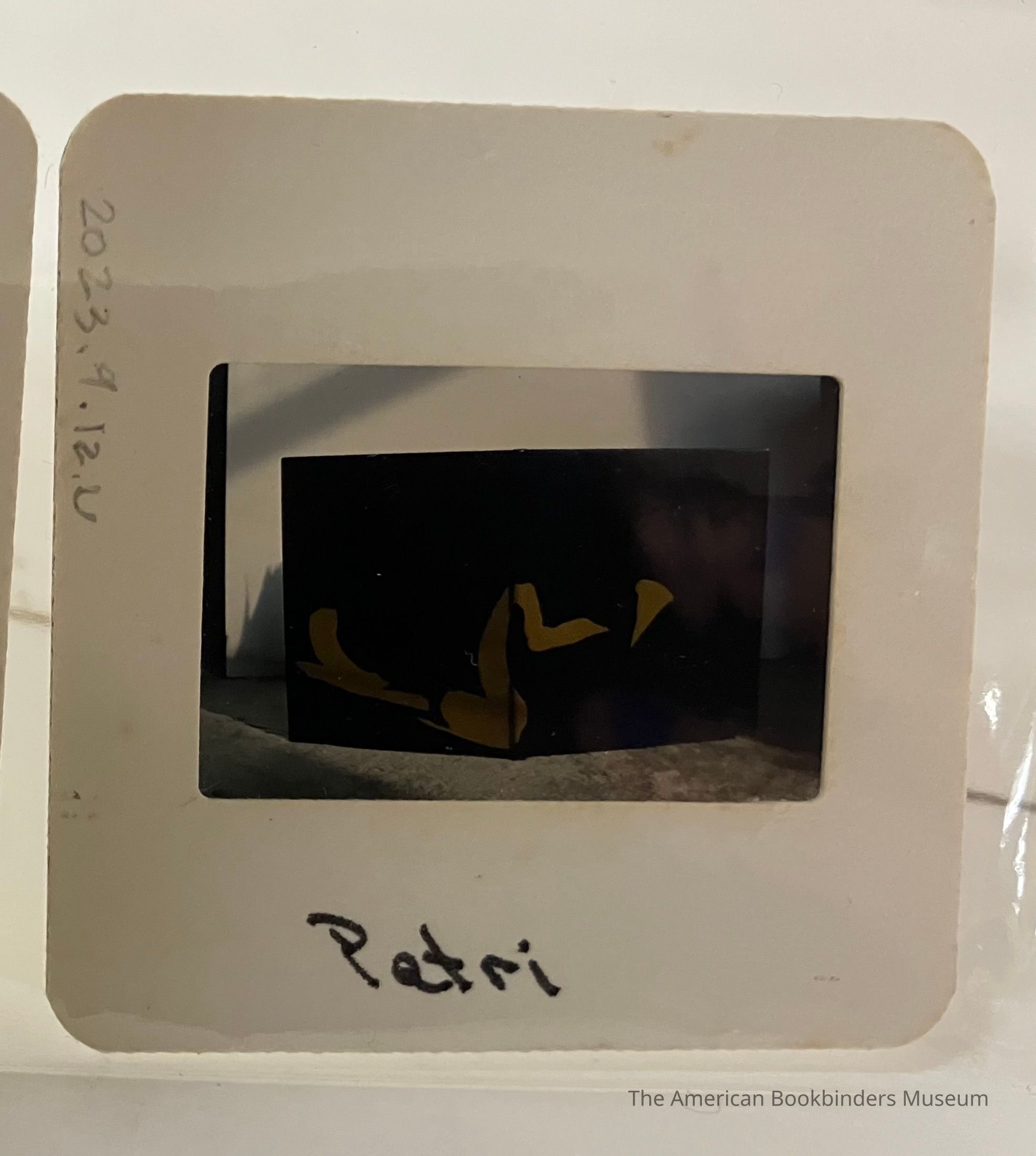 Slide showing a book with a black cover and gold designs. The book is propped up and opened to show the entire cover.