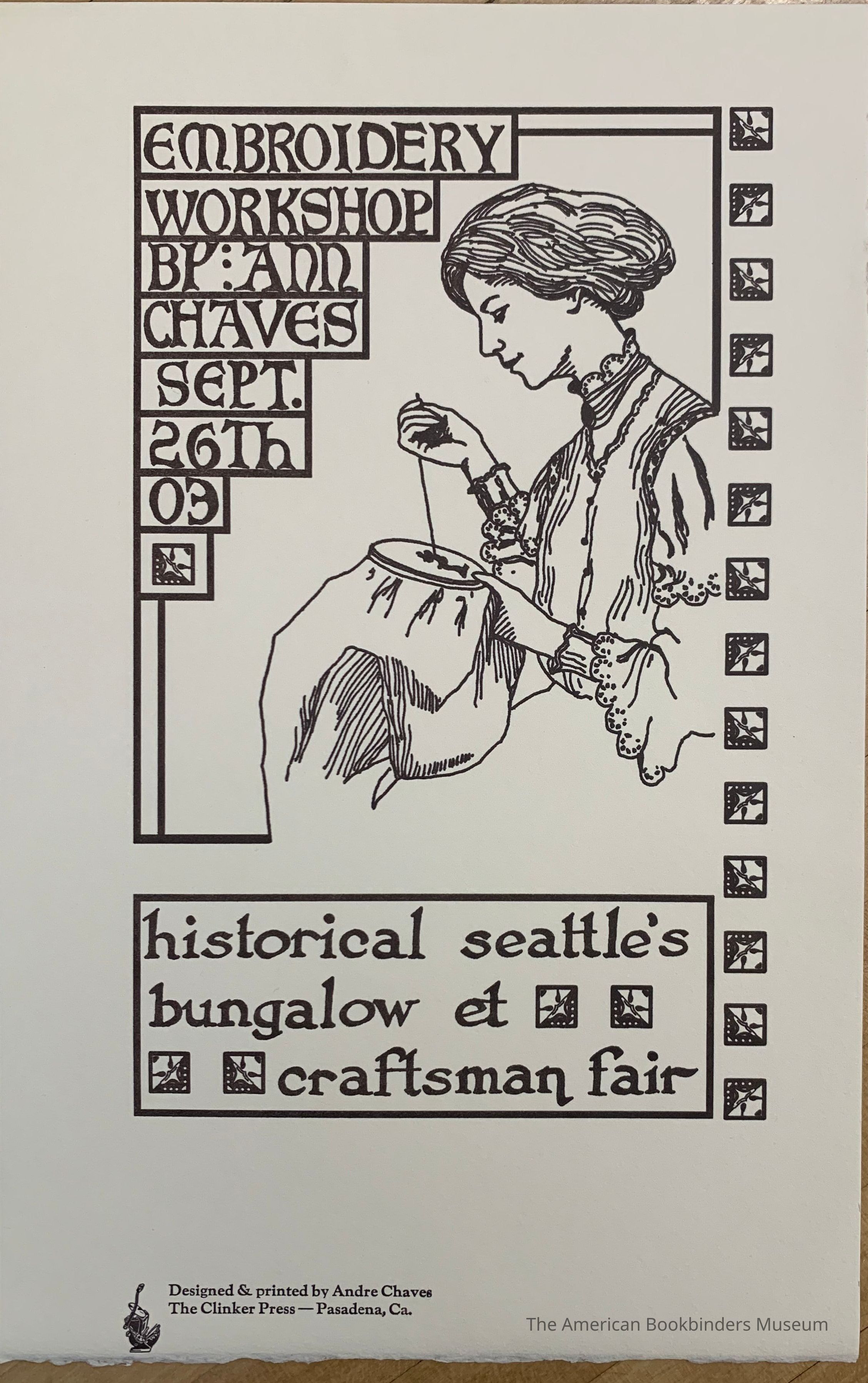 Poster for event, with image of a woman using an embroidery hoop. Cream paper with bottom deckled edge.Collection
