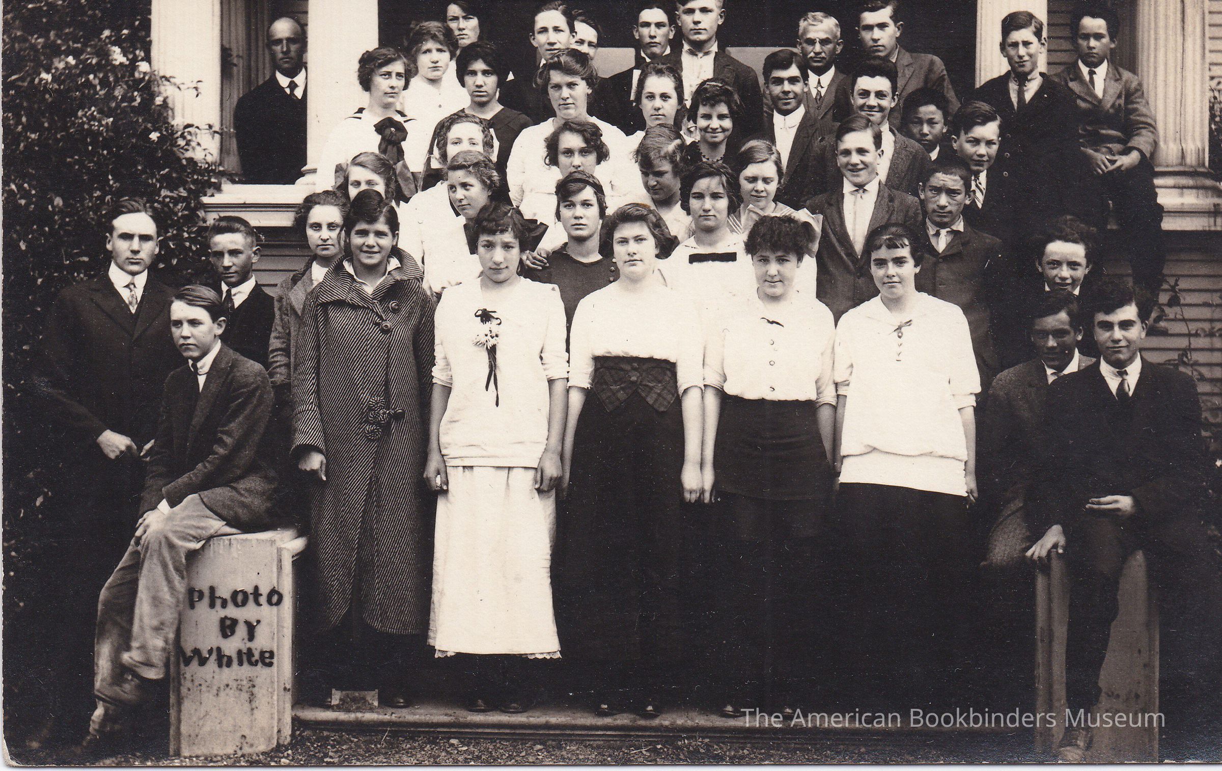 Black and white class photo of Stella Patri's high school class. She is in the front on the far right, in white. "Photo By White' is on the bottom left quadrant of the photo.Photograph Details