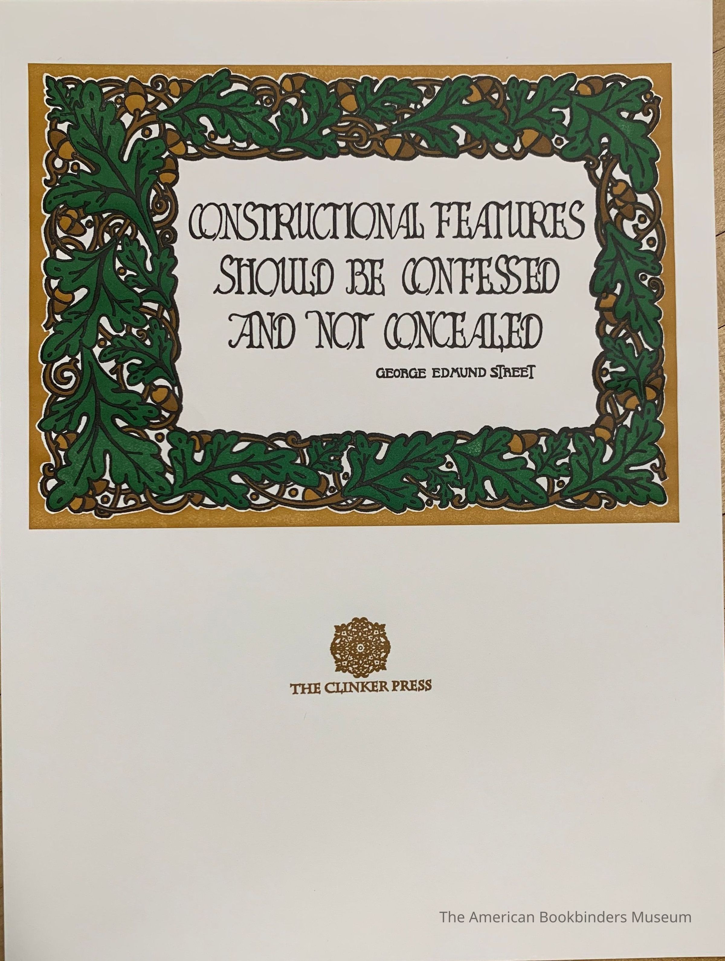 Top half is a frame of oak leaves and acorns, in browns and green. Text in the center in black. Below is a small knot work design with 'The Clinker Press' as a maker's mark.Collection