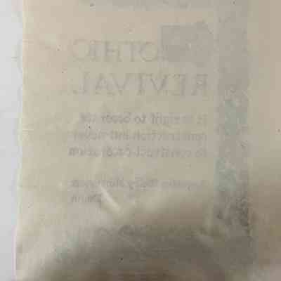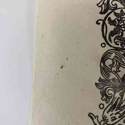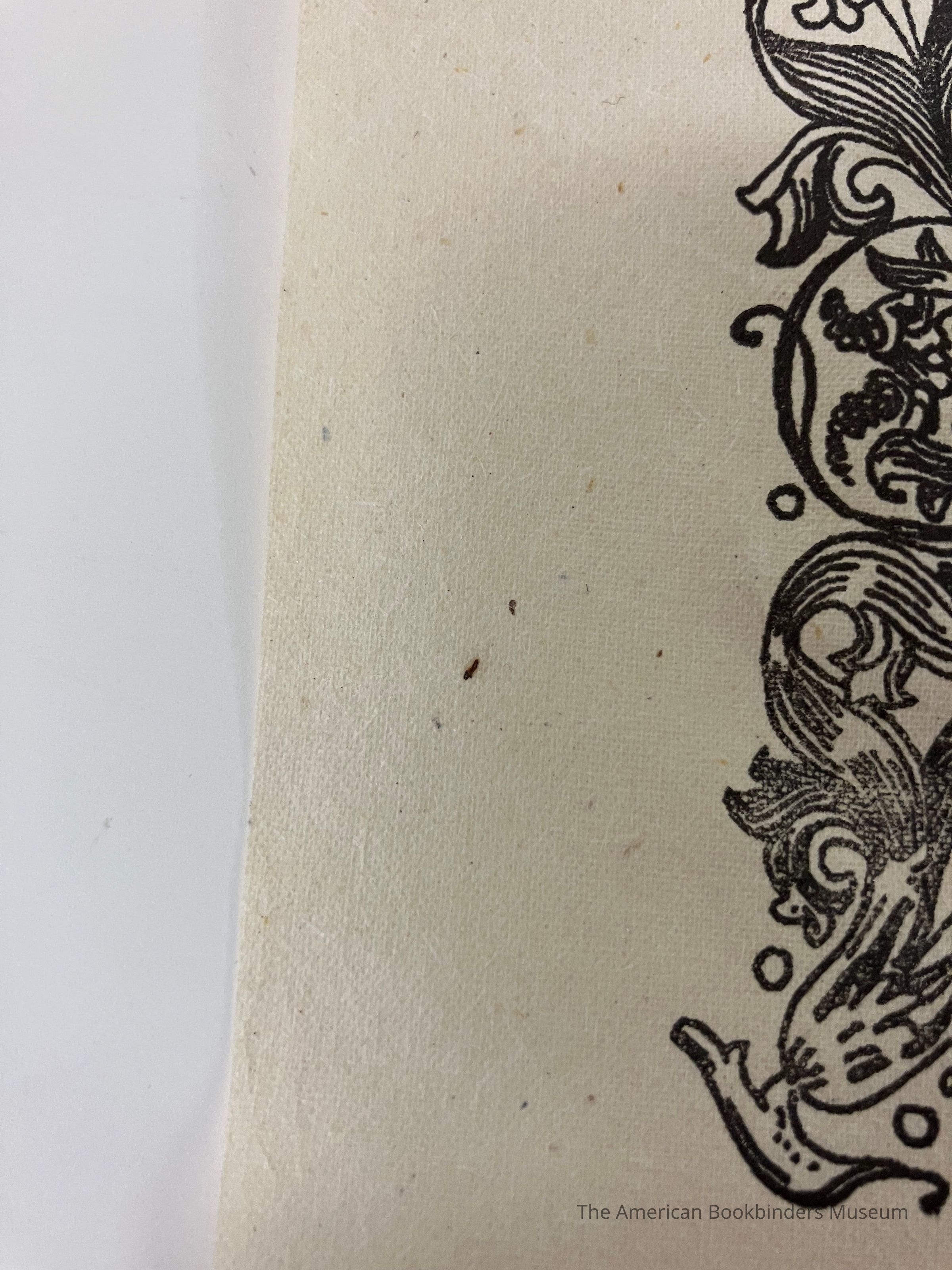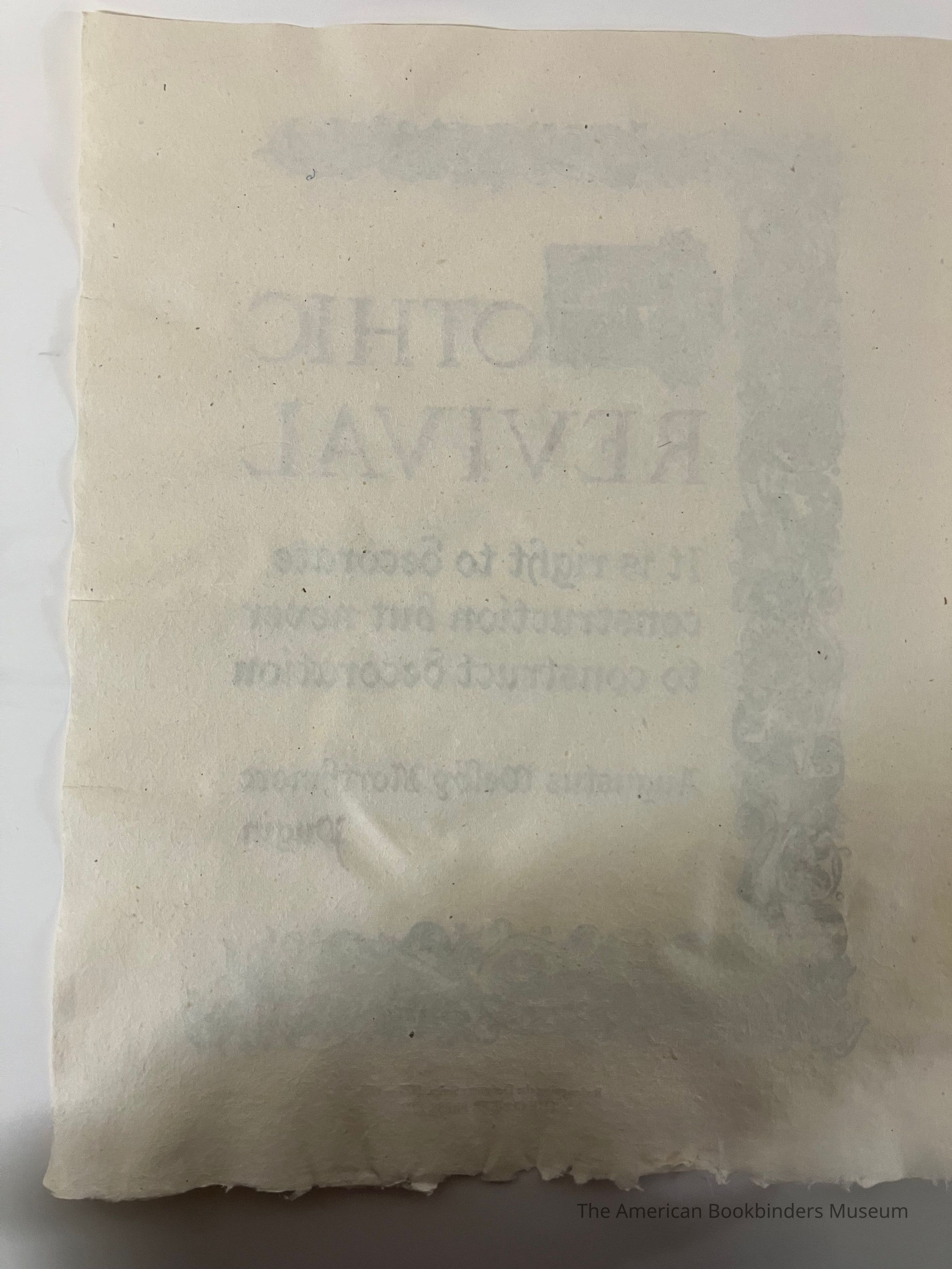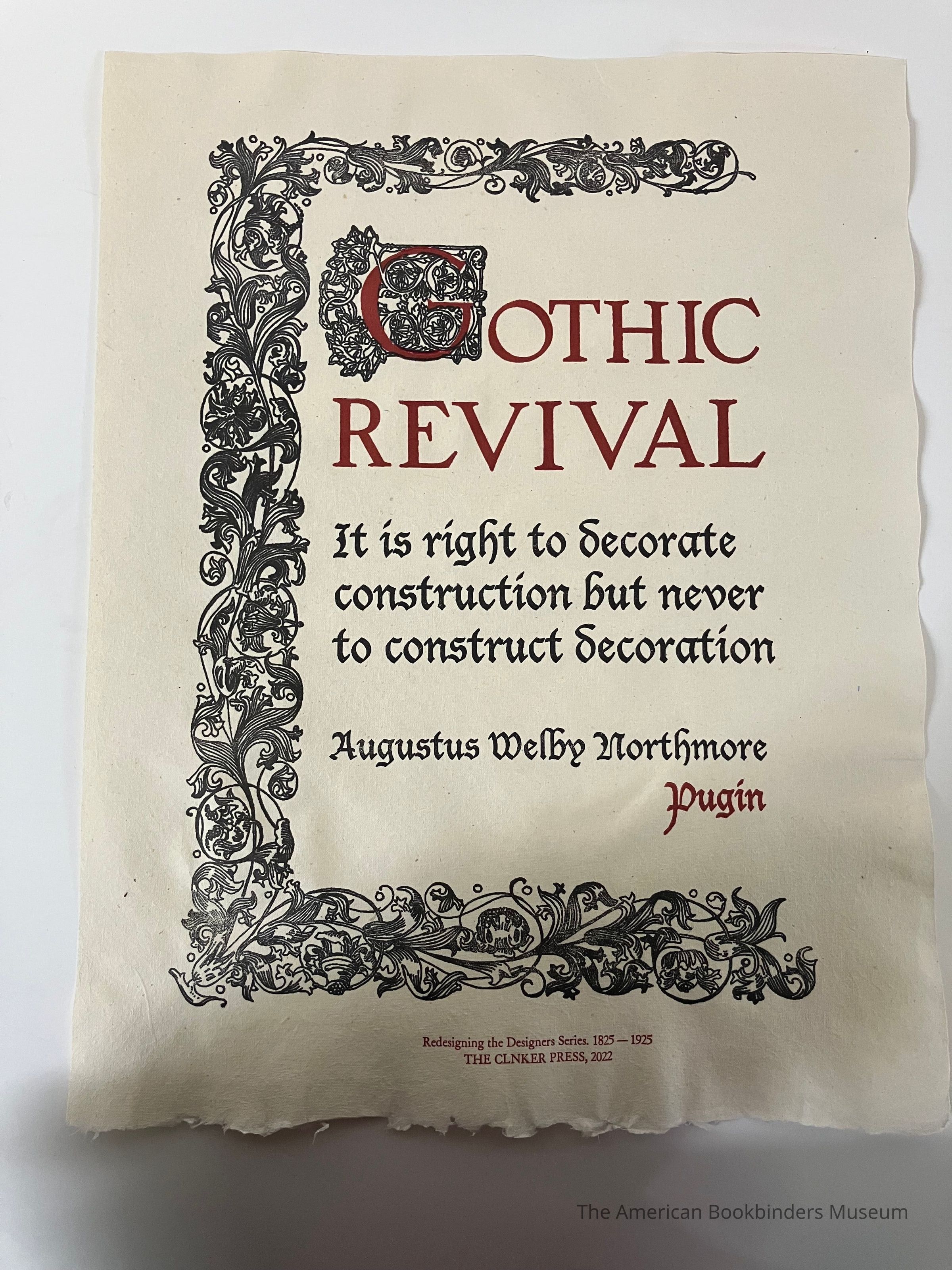 Curling leaves and vines create a top, left, and bottom edge, with text inside. Dropcap has a vegetal design. 'Gothic Revival' in red. Rest of the text is below. Author is at the bottom of the partial frame, mostly in black but 'Pugin' in red. Context below the frame, in red. Paper is a light brown with a raw bottom edge and ripples on the right and bottom edges.Collection