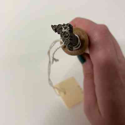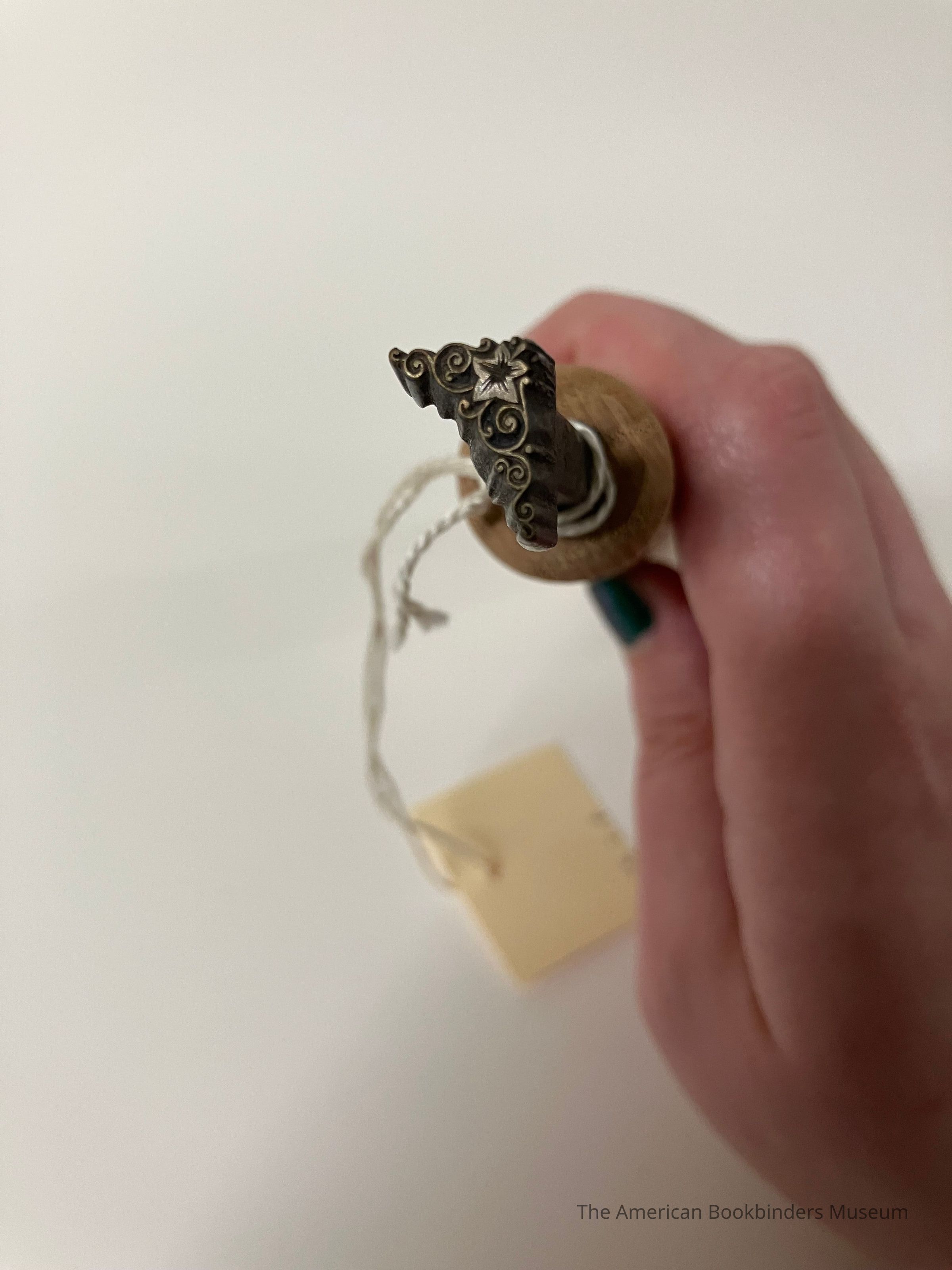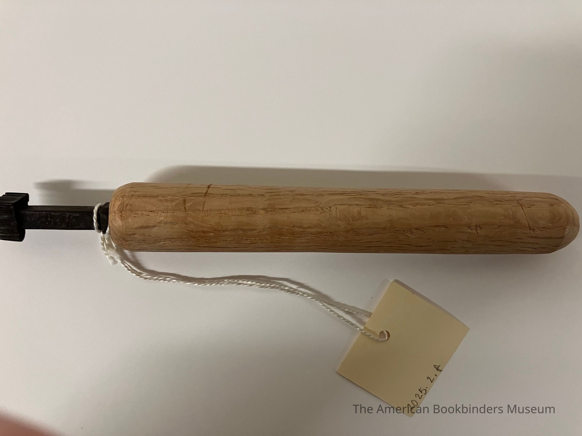 Hand tool with a design for a corner, made of curling shapes and a leaf. Handle is made of a light wood.Collection