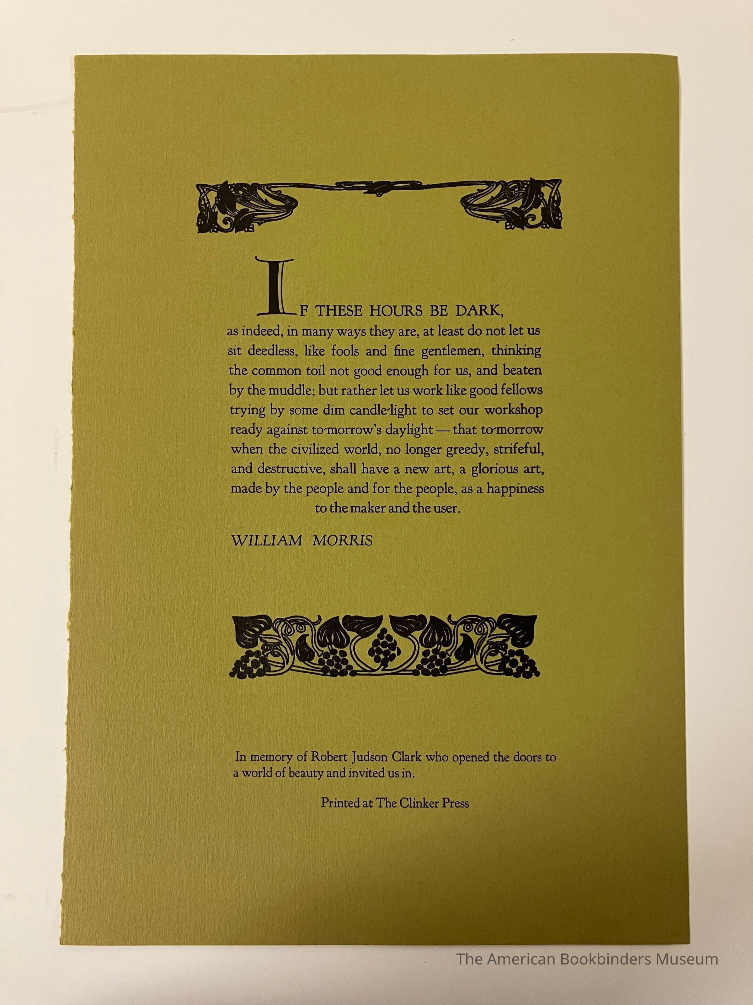 An olive green printed page with a paragraph of William Morris. Printed in memory of Robert Judson Clark.Collection