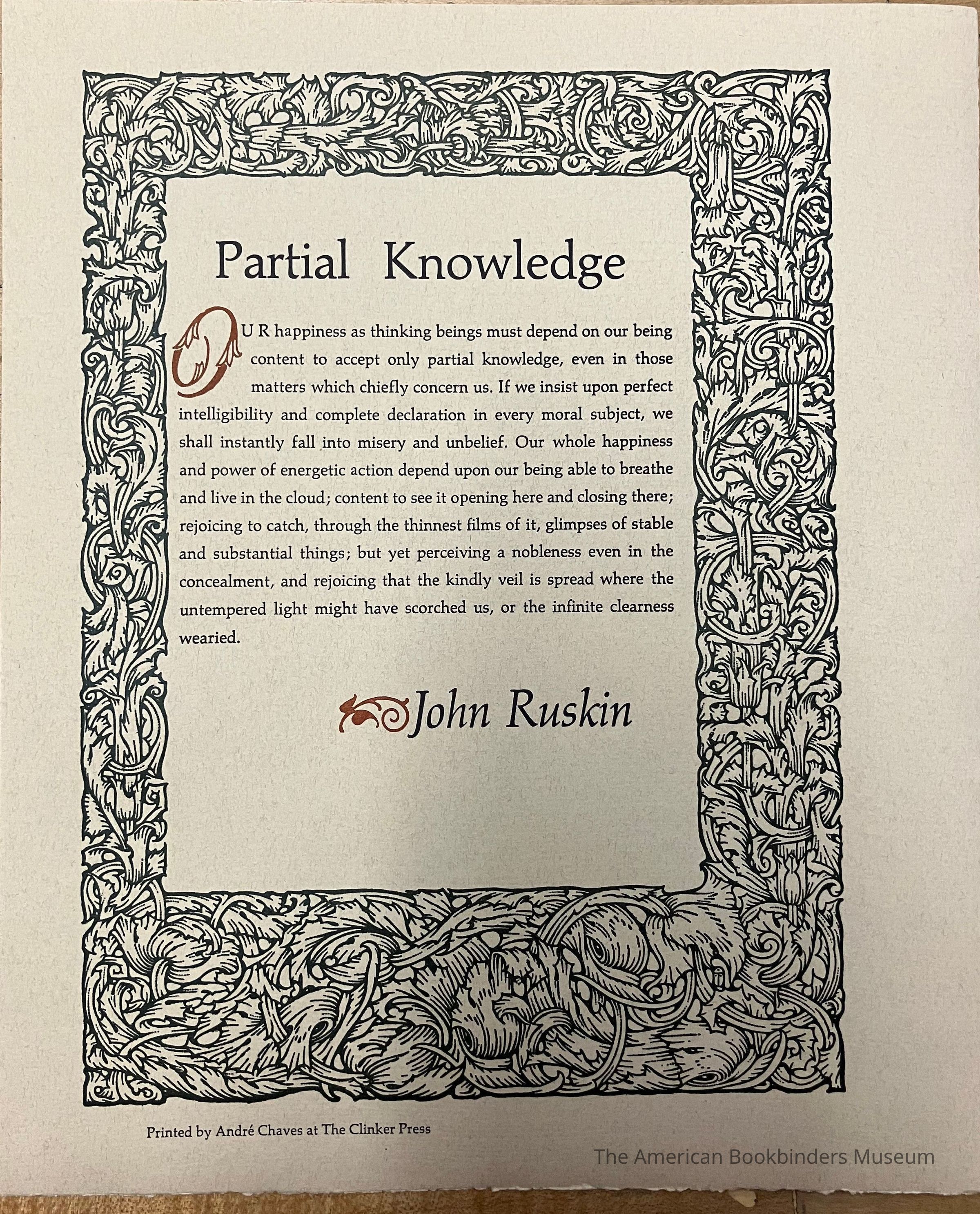 Wide border in dark green of leaves curling over themselves, with black text inside the border. Drop cap and design next to author's name in red. Light brown paper. Bottom edge deckled.Collection