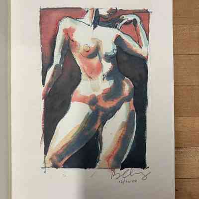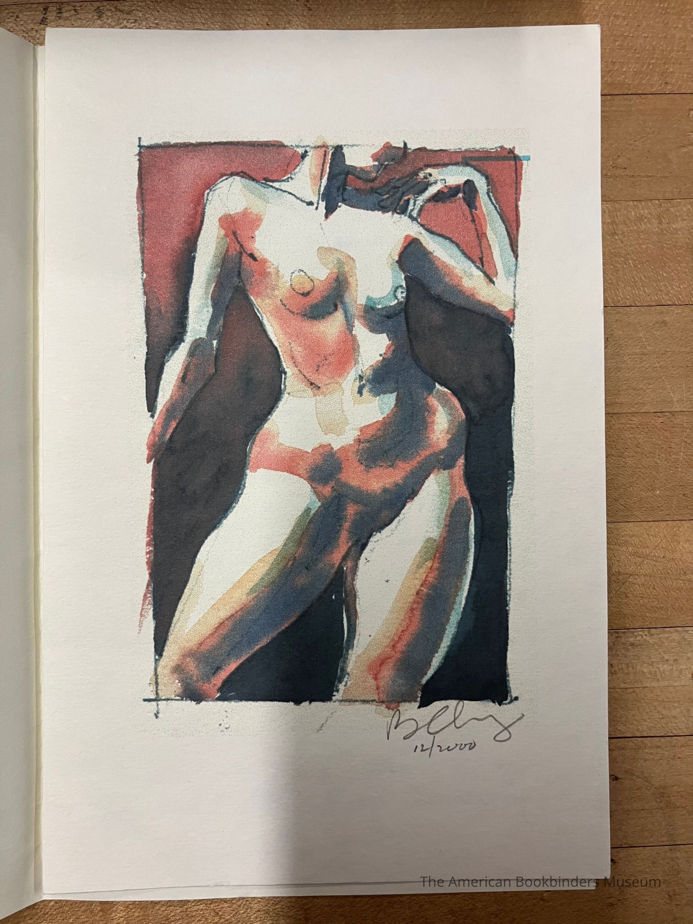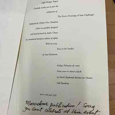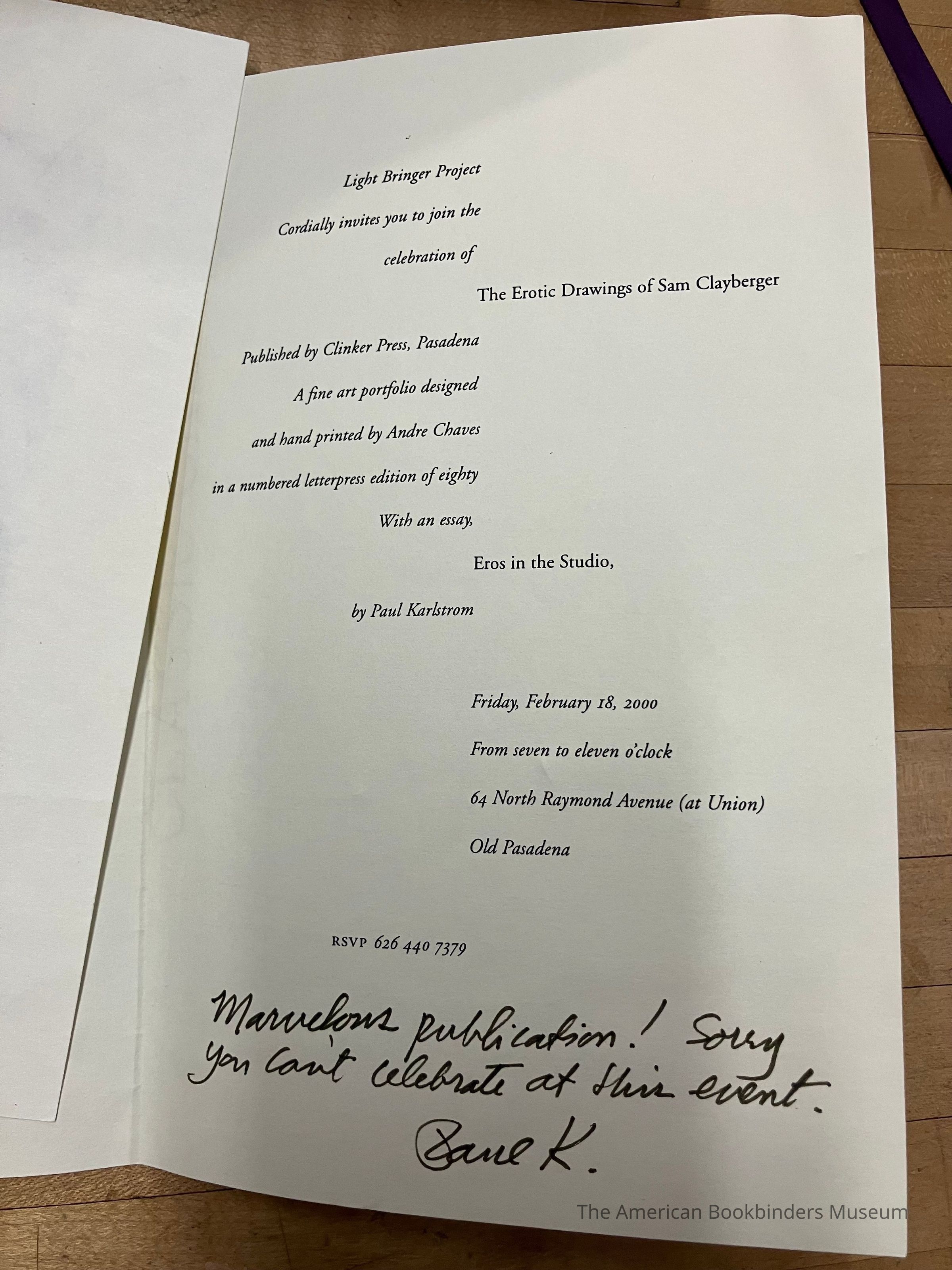 Leaflet as invitation for the catalog "The Erotic Drawings of Sam Clayberger", for the exhibition at Prufrock Gallery. At the bottom of the inside page is a note by Pul Karlstrom. A print or watercolor has been tucked in, showing a female nude in gray, green, and red.Collection