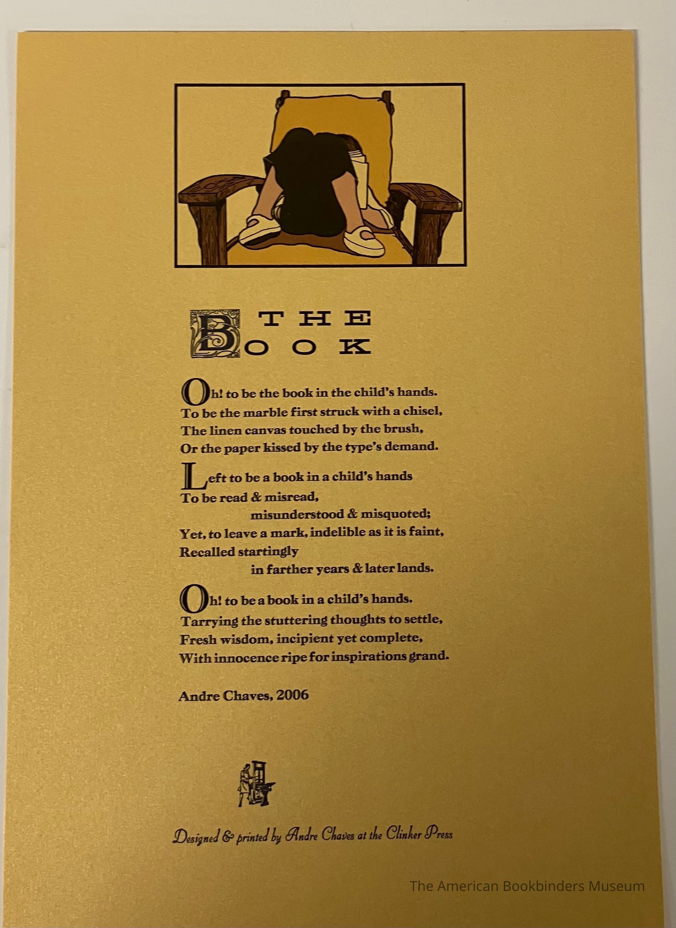 Yellow paper with a fine shimmer. Top quarter has an illustration of a kid with a book, knees pulled up in an oversized chair. Poetry below, in black ink. First drop cap (the title) in a dark blue with a vine design.Collection