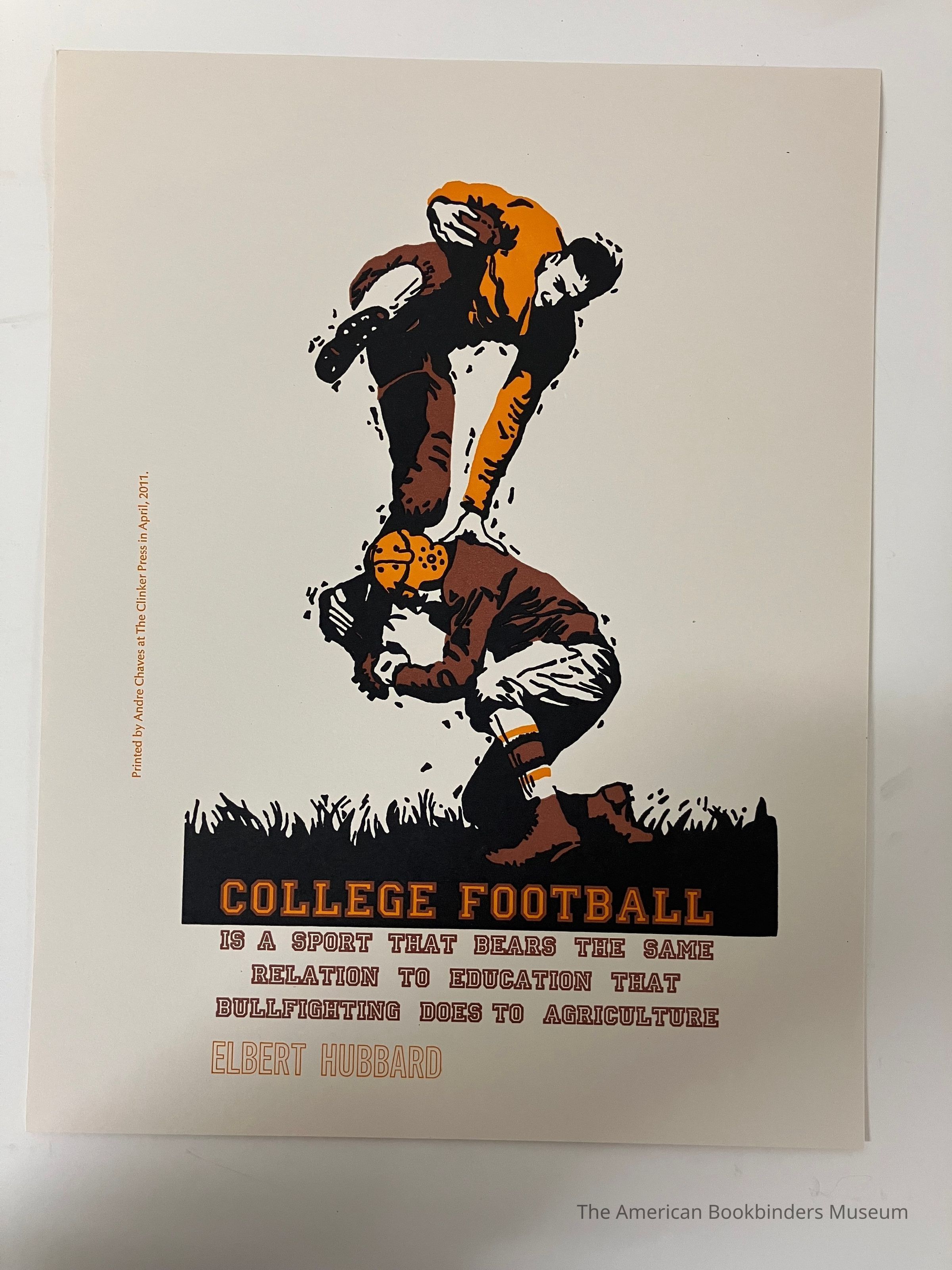 Poster / broadside showing two men plying football in older-style uniforms. First line of text is in the grass, with the rest below. Ink in orange, brown, and black.Collection