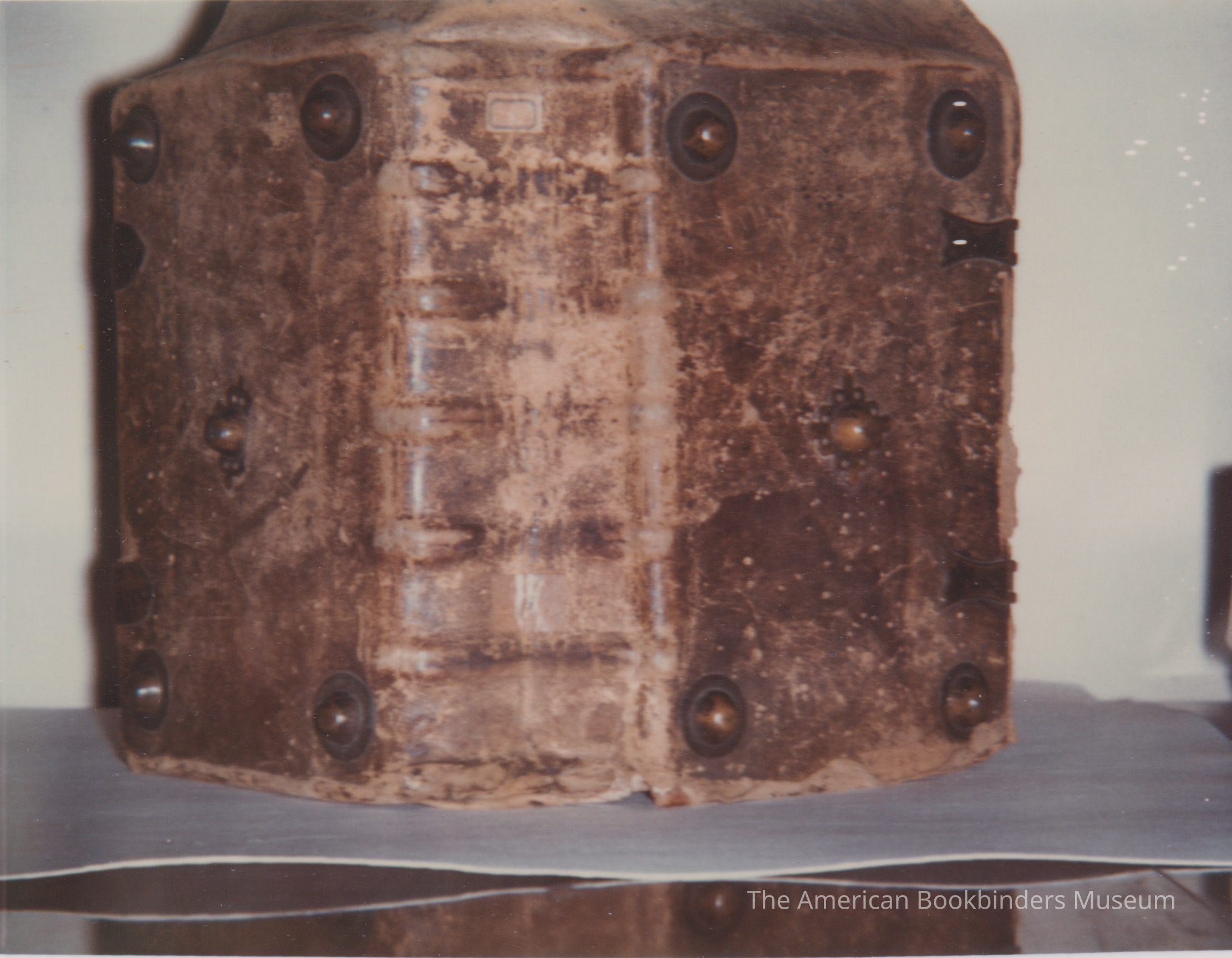 Photo of the same book as 2023.9.11.aa. This time the leather that would normally be glued on the inside cover is visible above the cover.