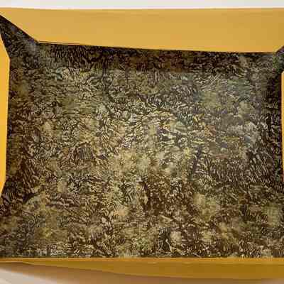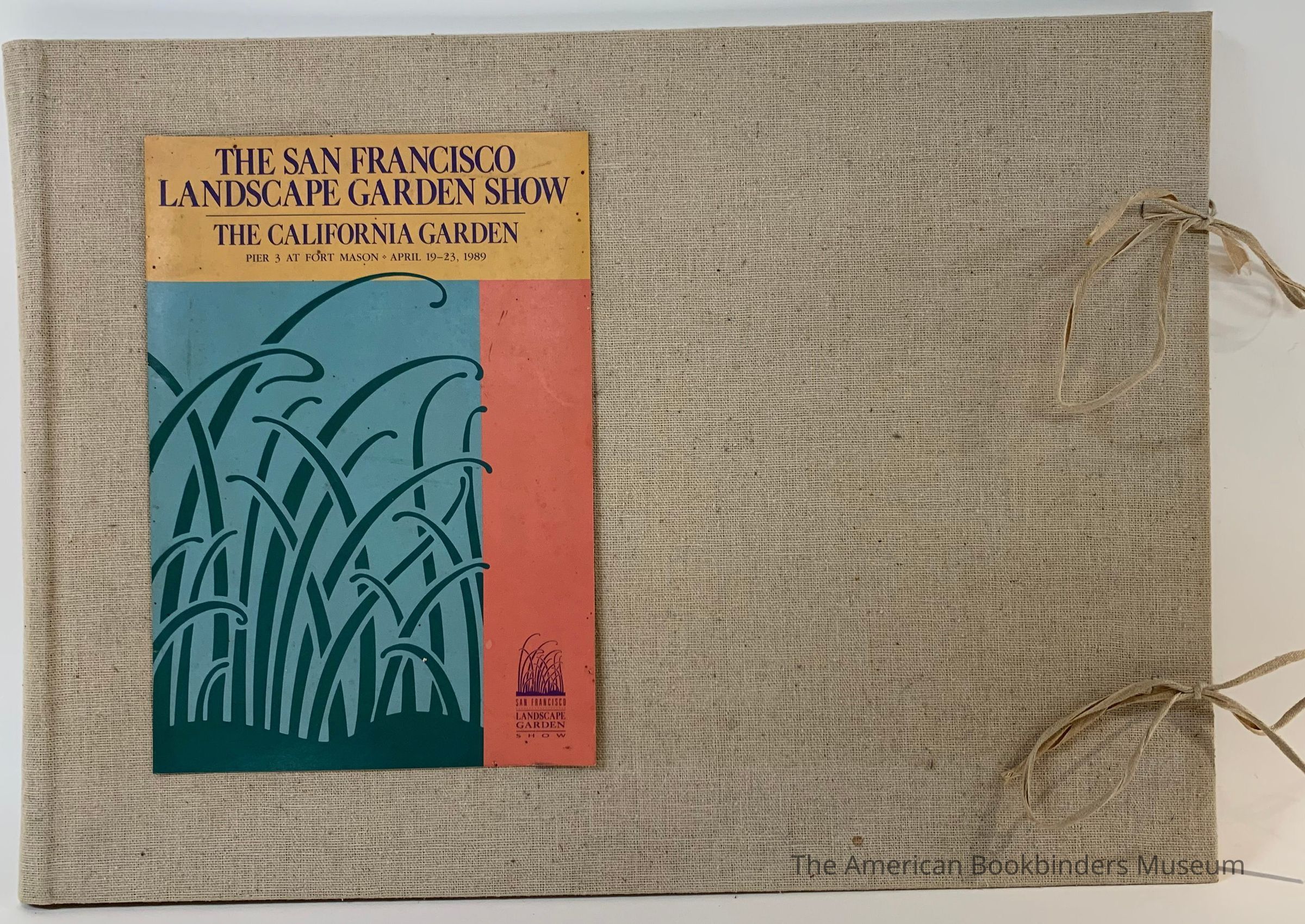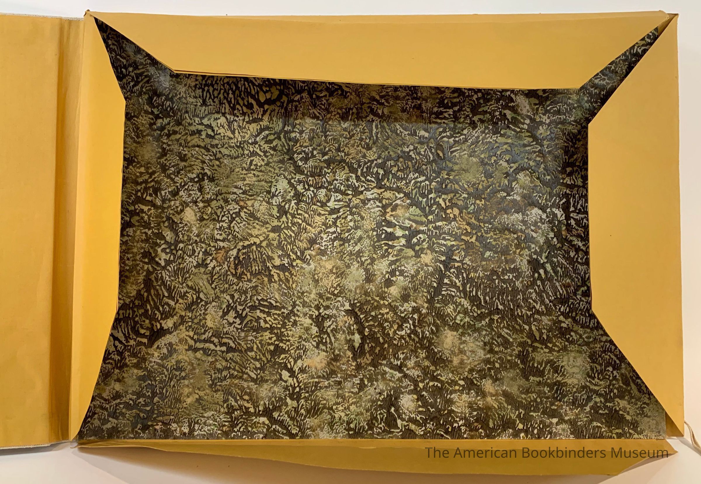Boards covered in off-beige fabric with archival ribbon ties. Interior has envelope folds of dark gold paper for holding loose sheets. Brown embossed mottled paper glued to back board.