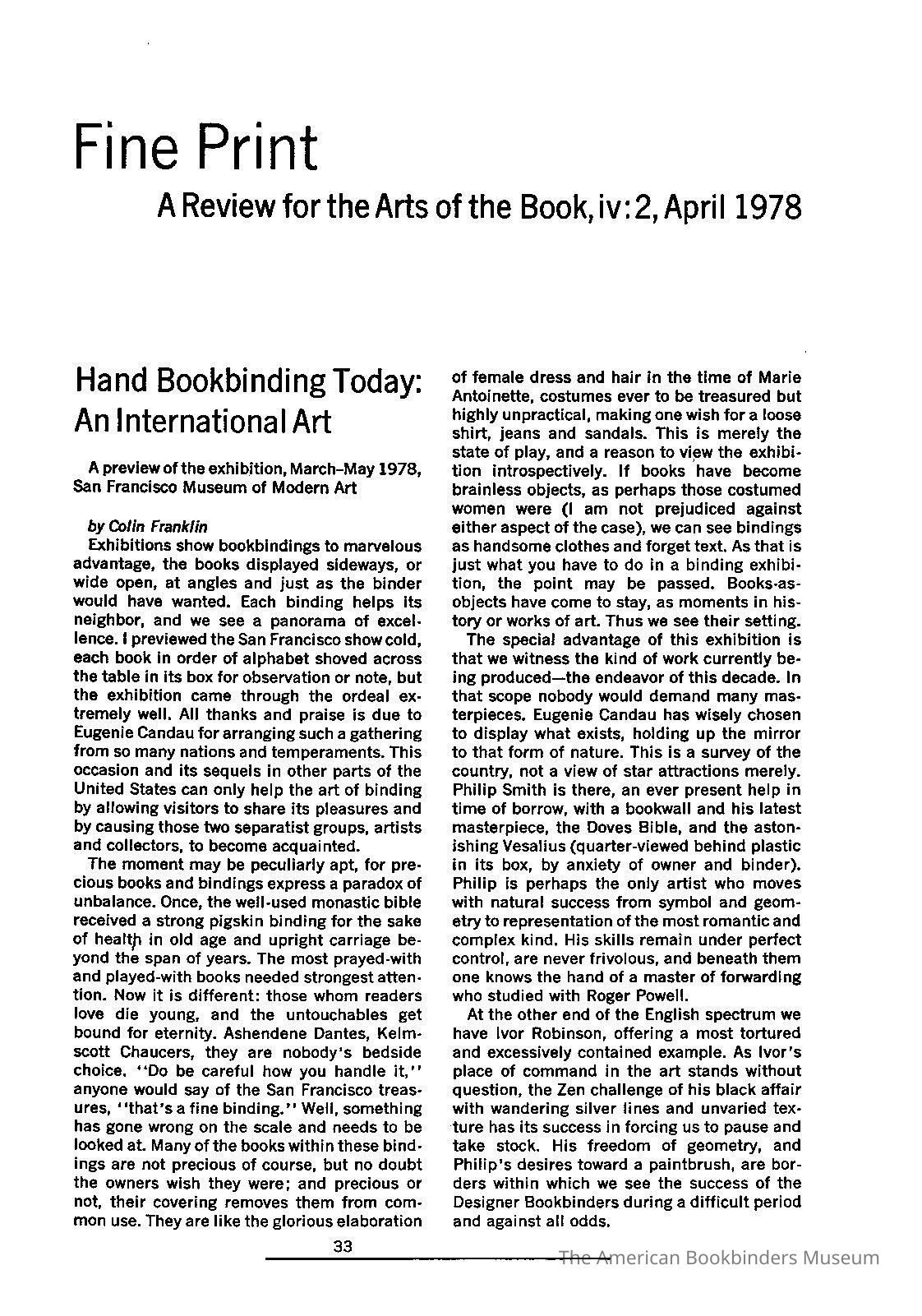 "Hand Bookbinding Today: An International Art";