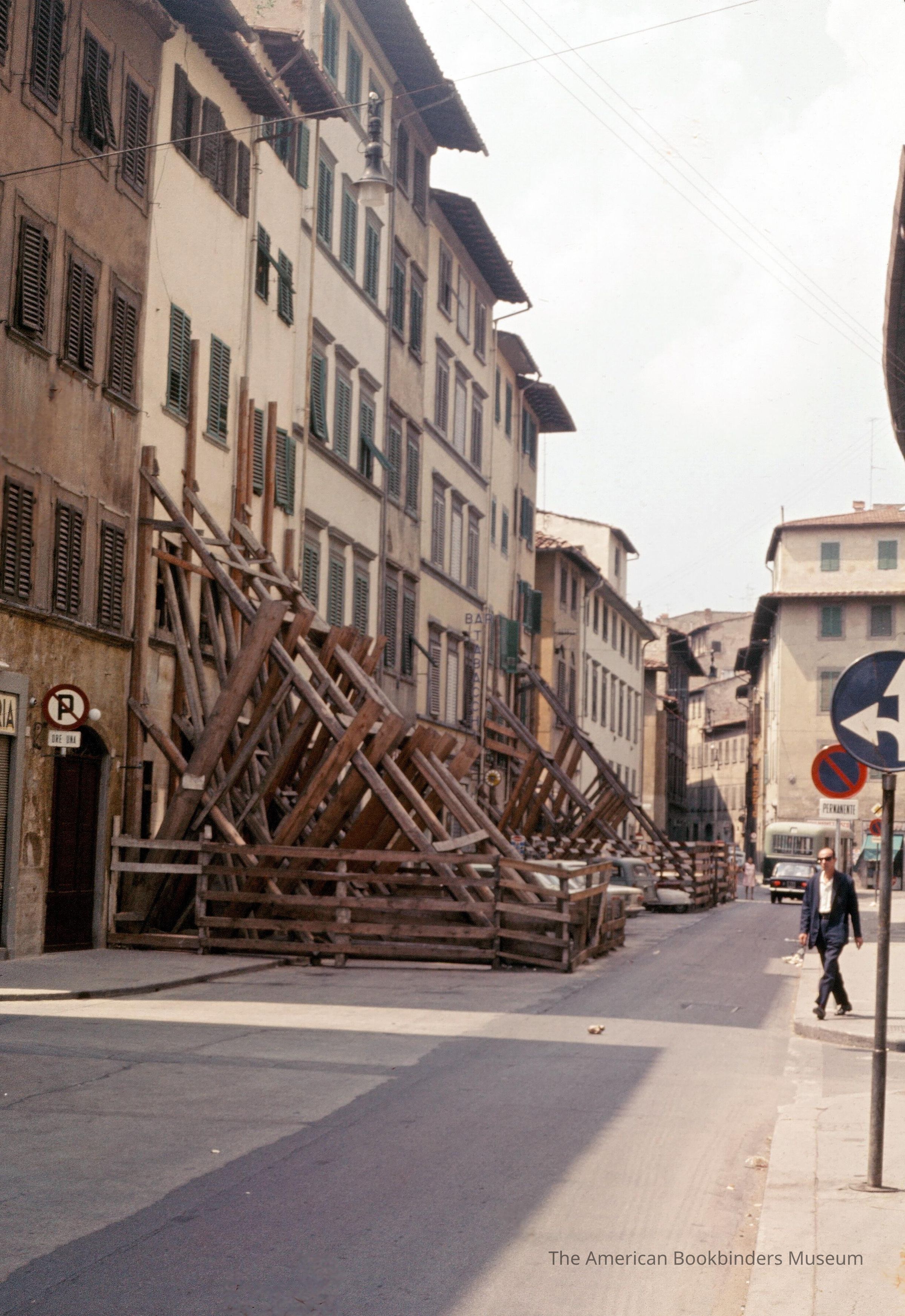 A scanned photo showing a row of buildings being supported. Shows the aftermath of the flood in Florence.Relationships