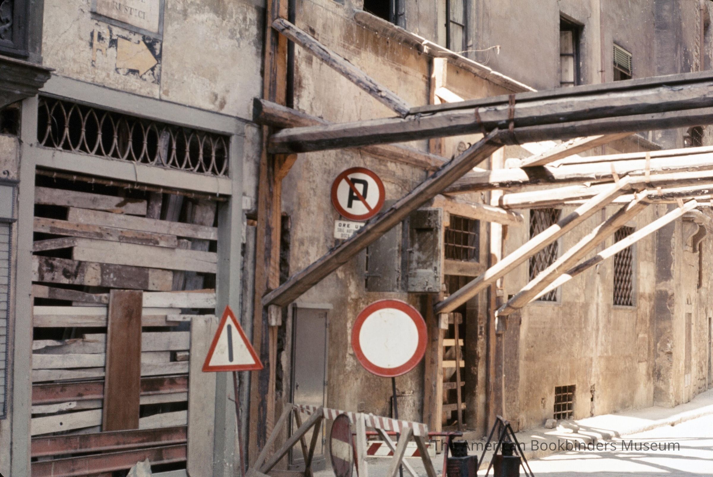 A photo showing a set of buildings being braced with wooden support, which stretches out of frame.Photograph Details