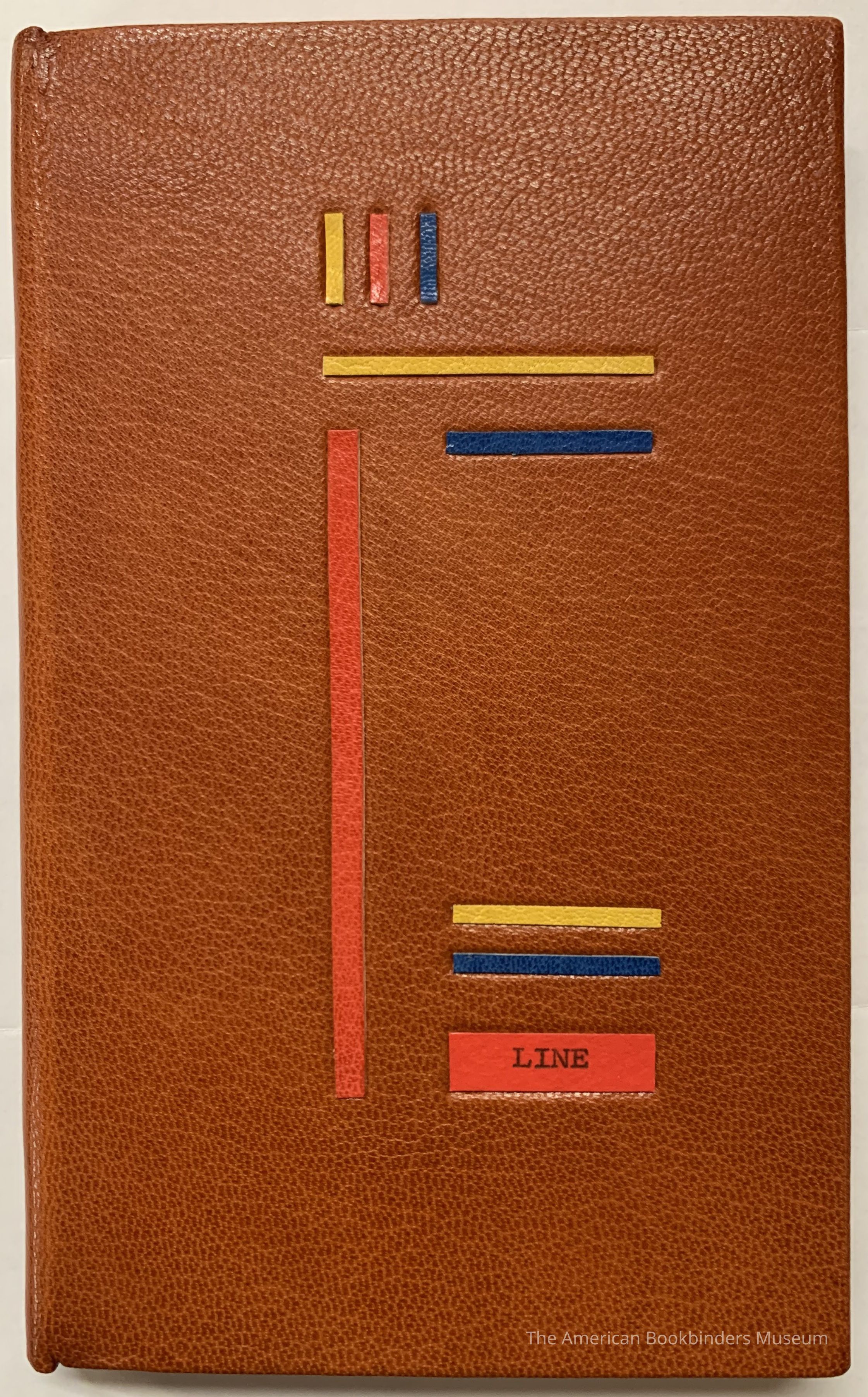 Bound in full burnt-orange leather, French technique, top edge painting, sewn headbands, leather hinges, leather inlays on cover, maroon endpapers.