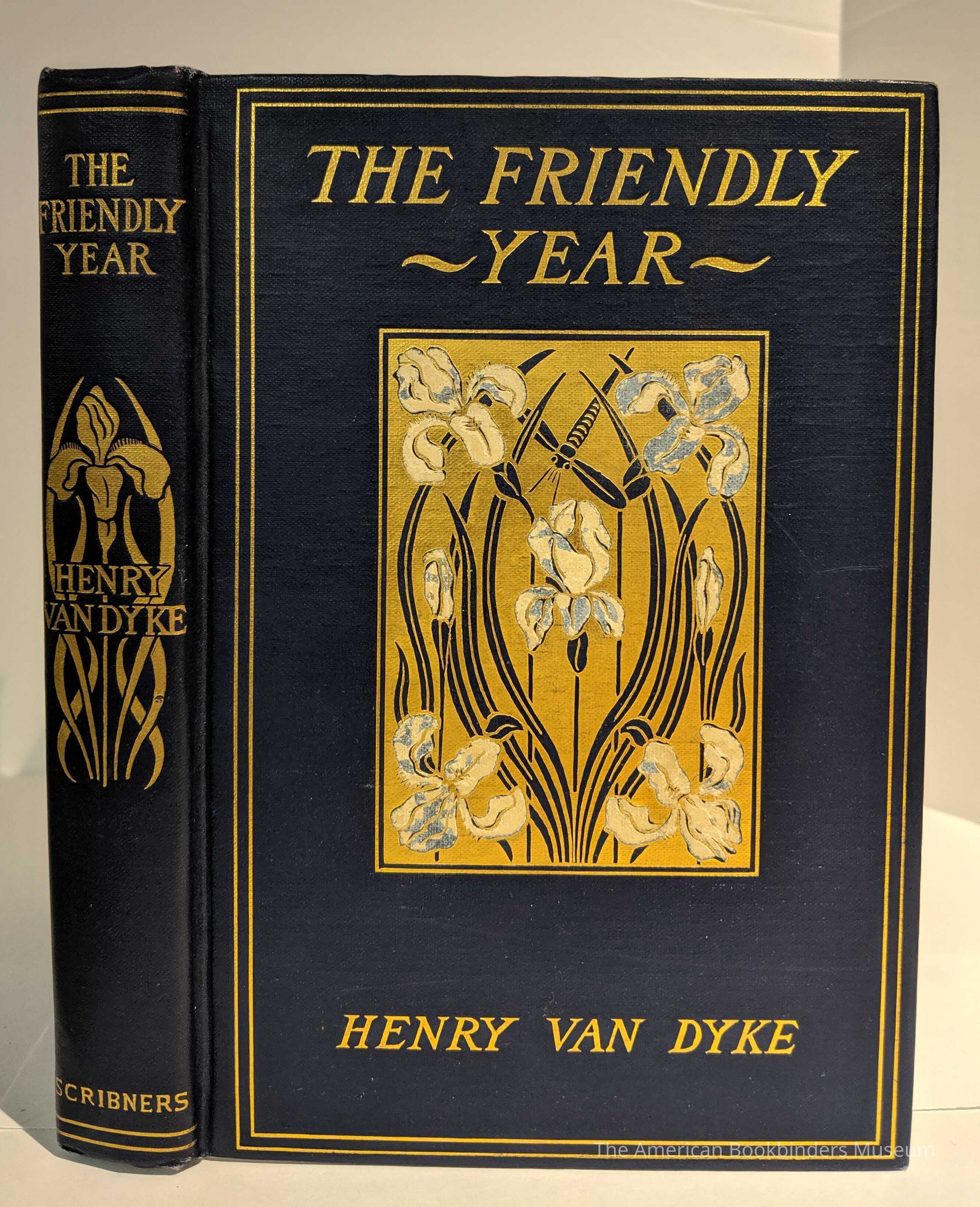 Bound in royal blue cloth with a rectangular panel stamped in gilt and white, depicting an art nouveau garden scene of white irises and a dragonfly, set within a double-ruled gilt border. Iris motif repeated to spine. Top edge gilt.