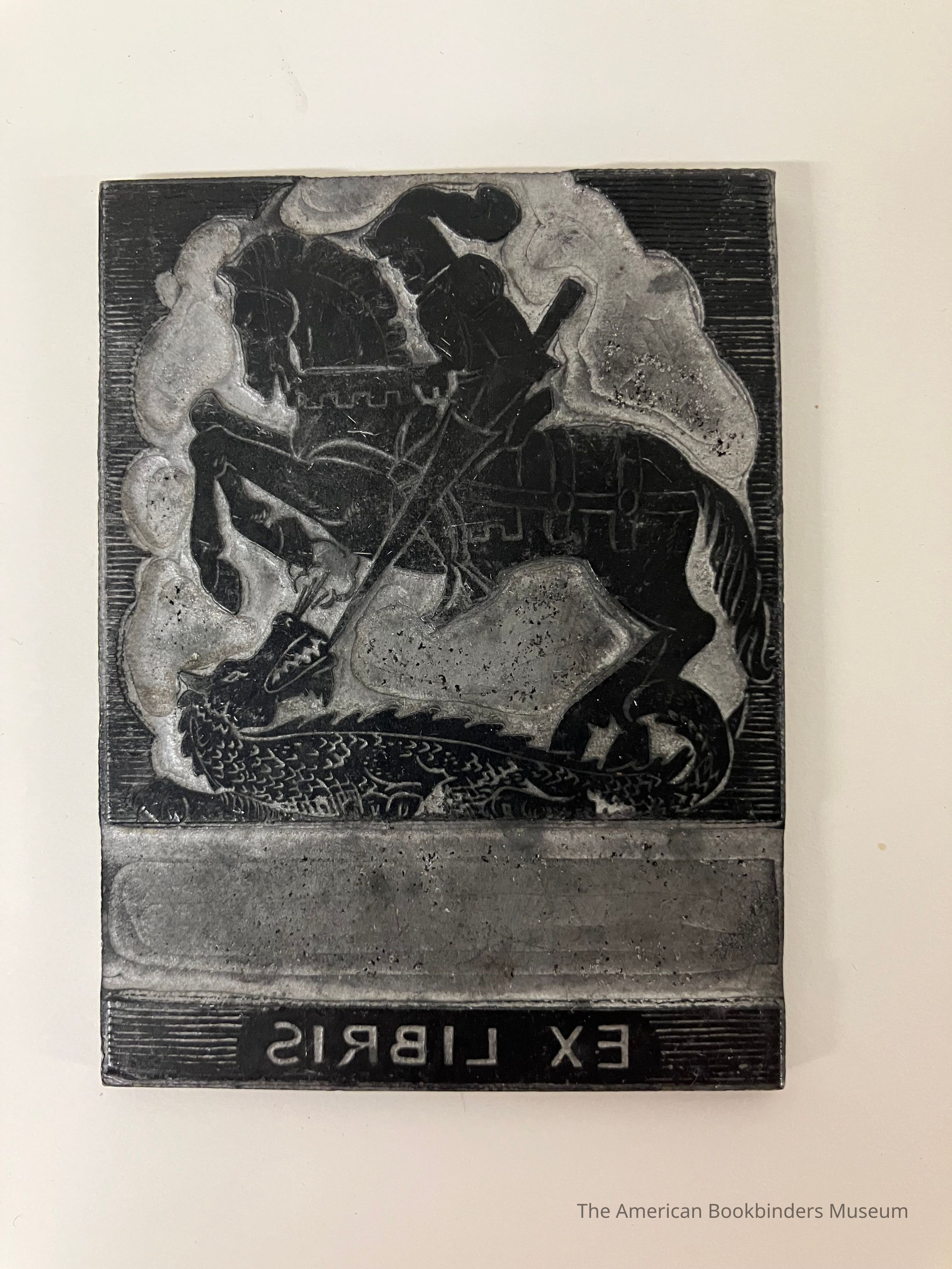 A letterpress stamp of metal for a bookplate showing Saint George on horseback, with a dragon below. 'Ex Libris' is at the bottom of the image.