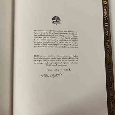Colophon at back - Deluxe set numbered 1-175 and hardbound by Ludlow Bookbinders in quarter goatskin leather and solid oak boards.Notes