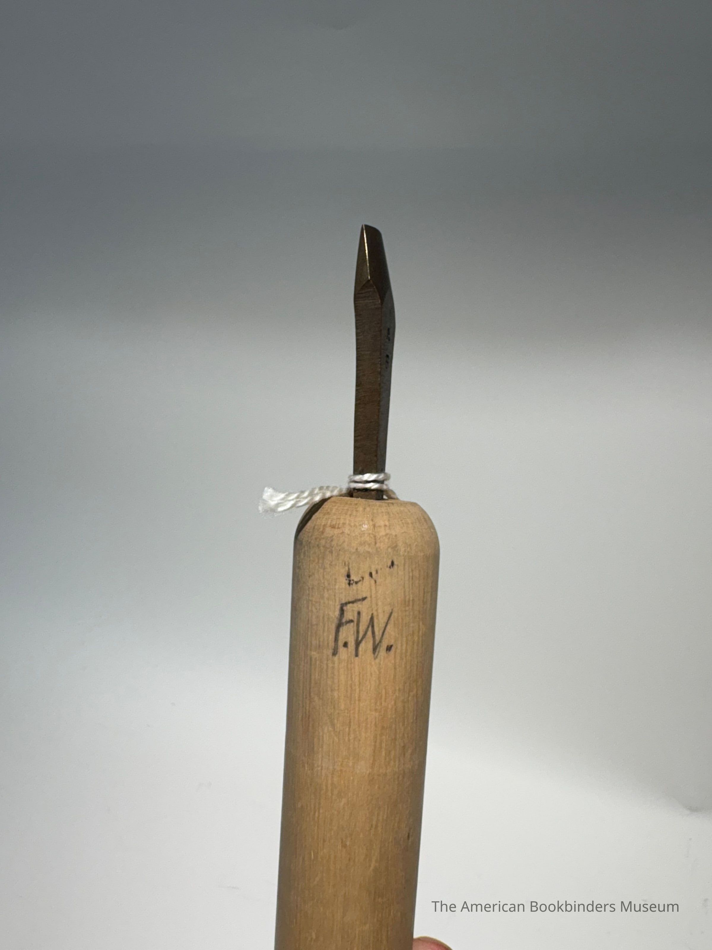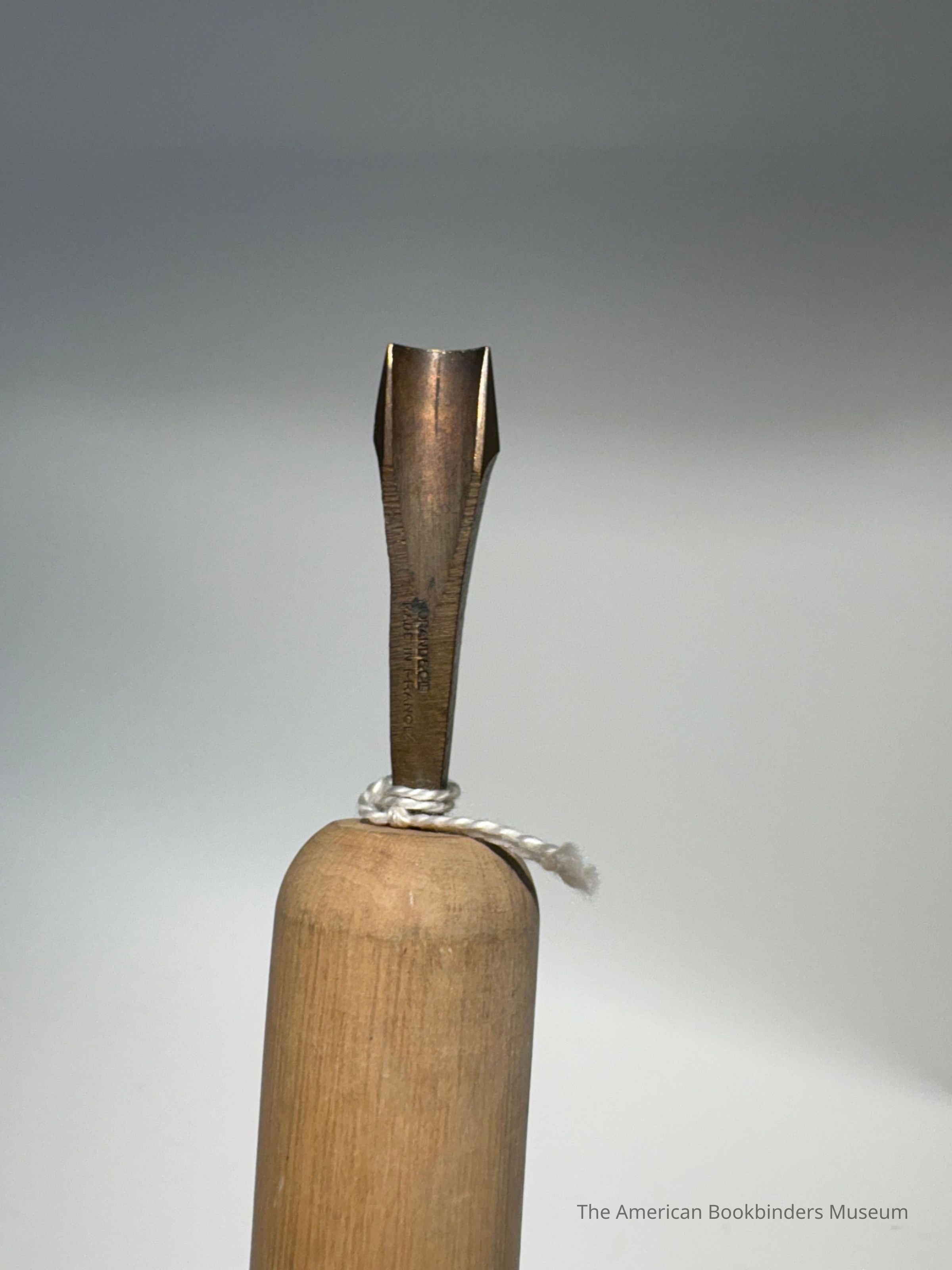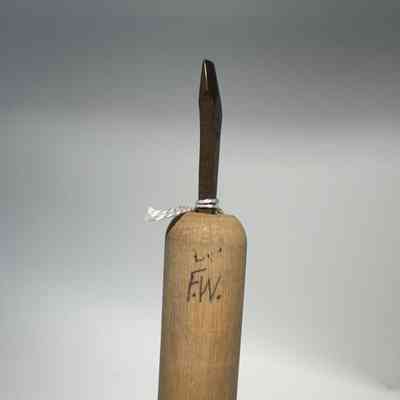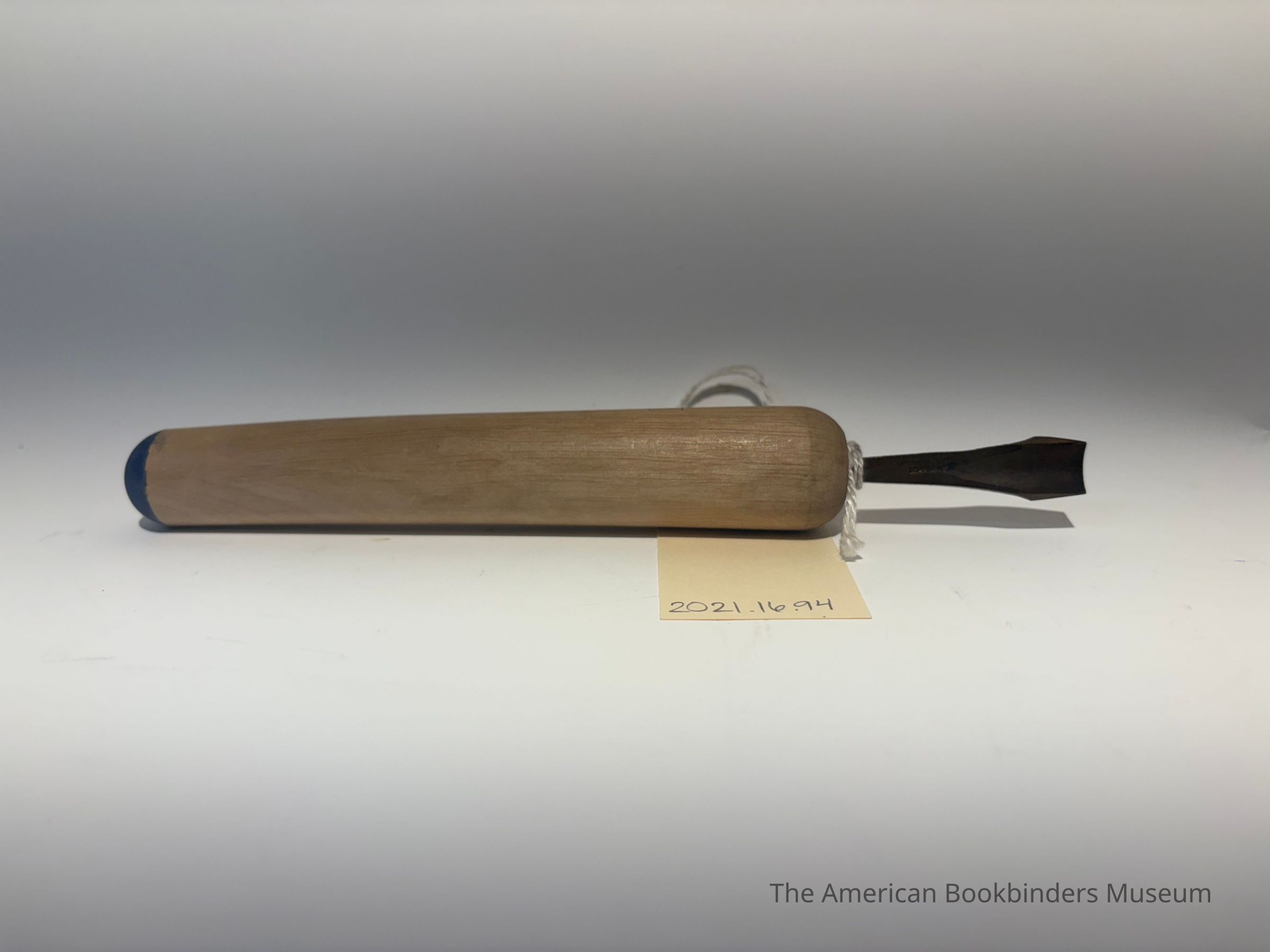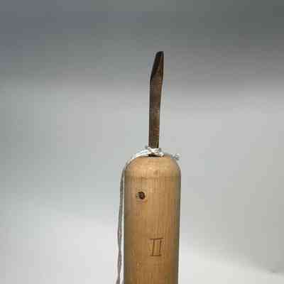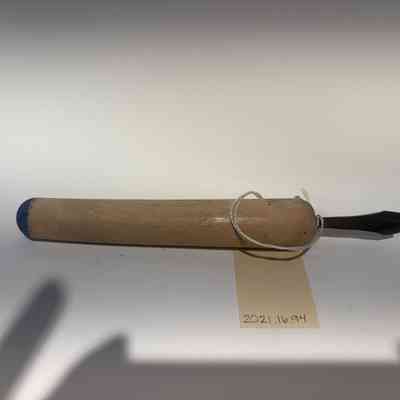 Metal gouge hand tool with light wooden handle. The end of the handle is painted blue.