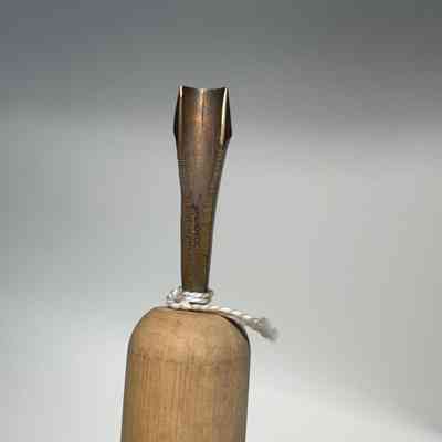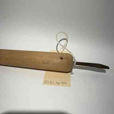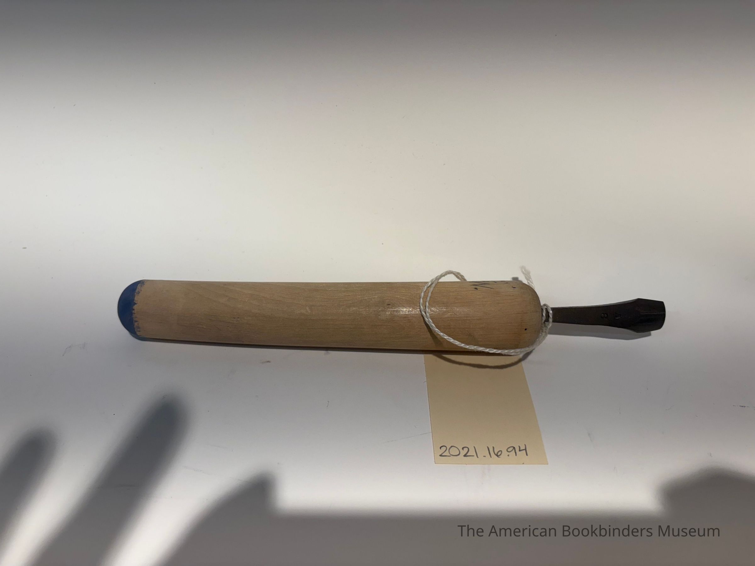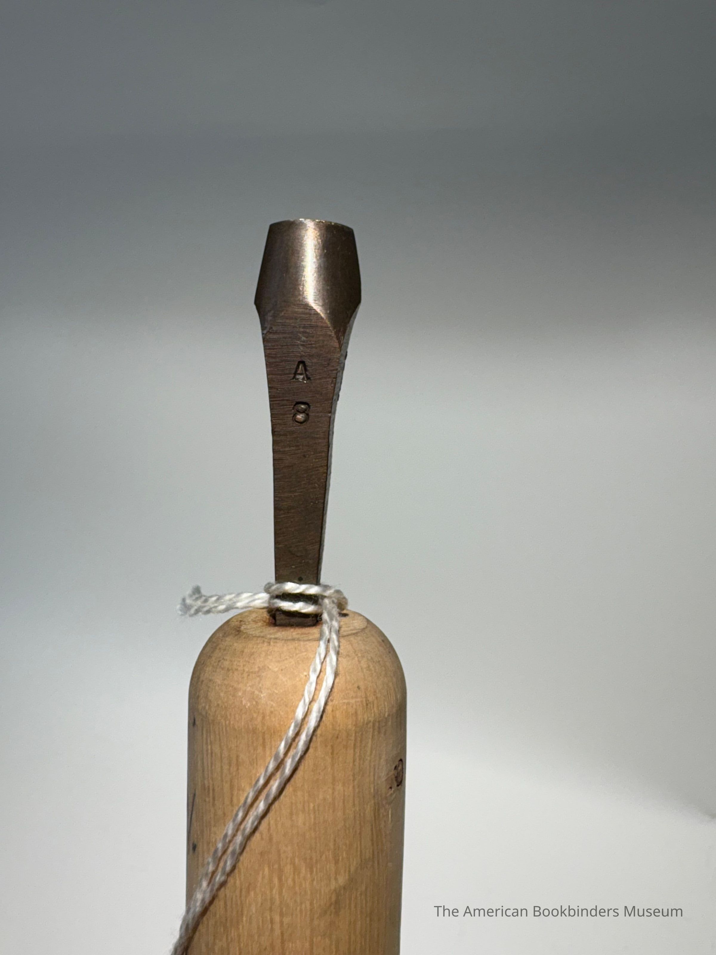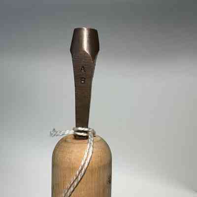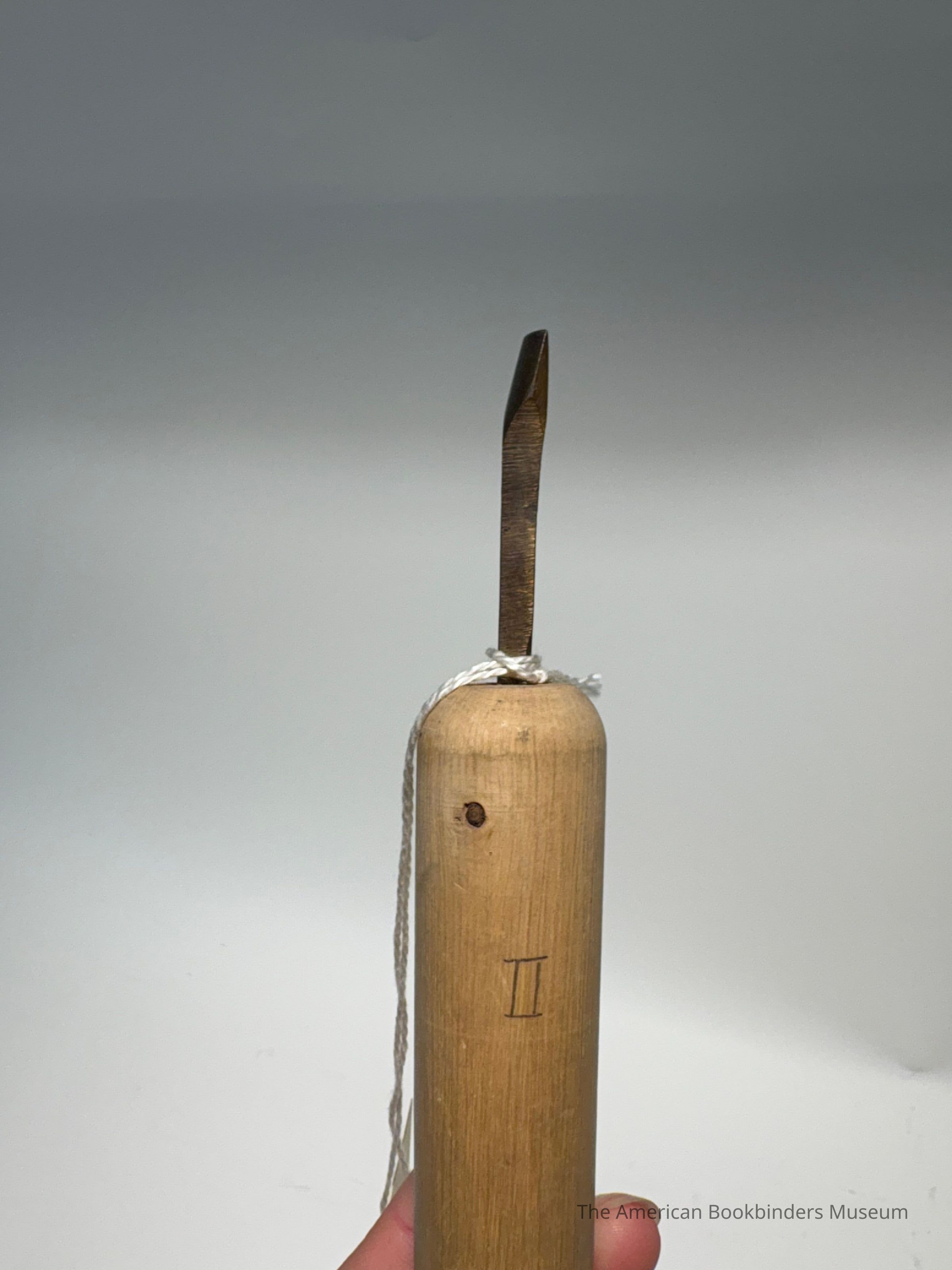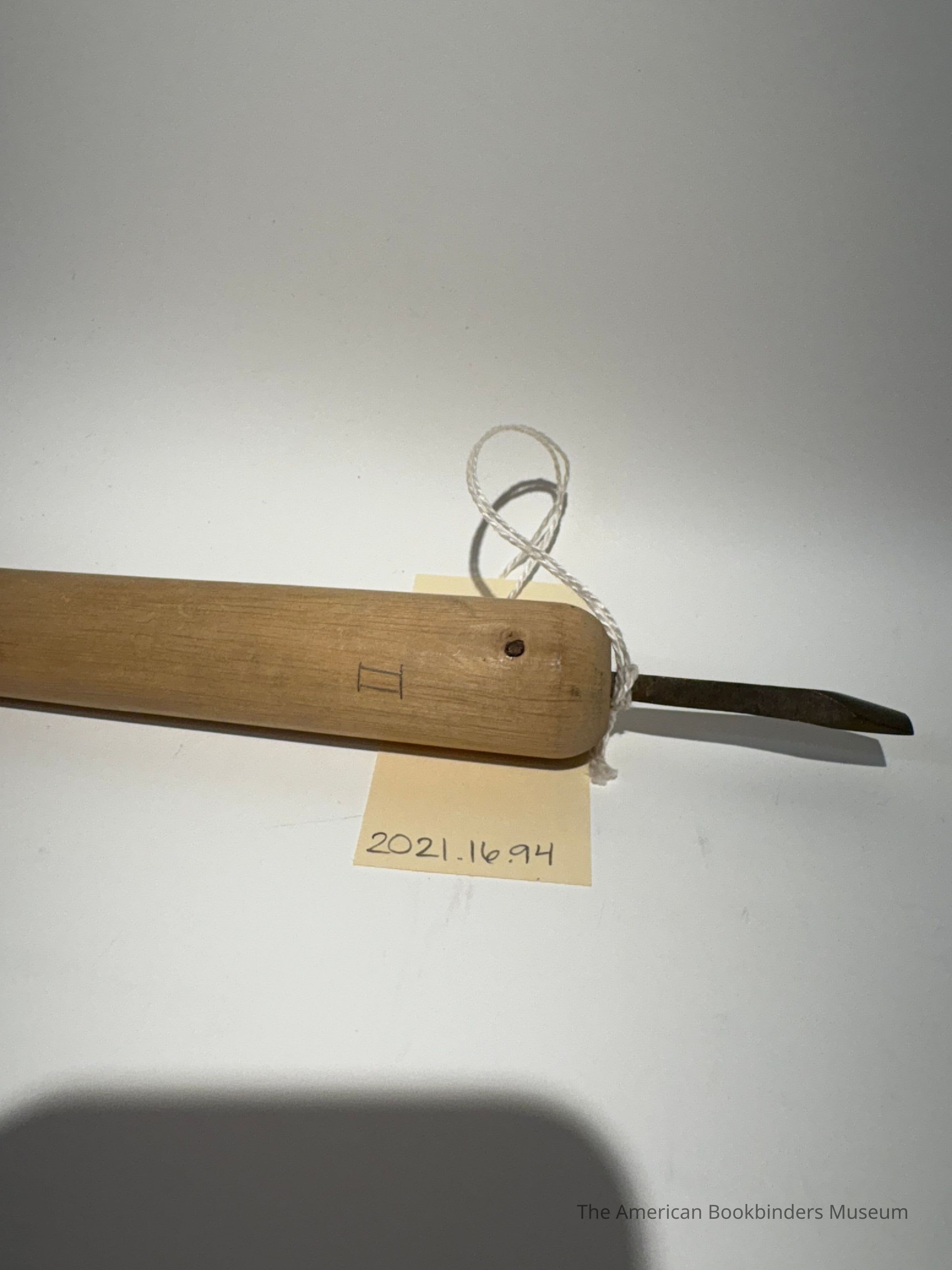 Metal gouge hand tool with light wooden handle. The end of the handle is painted blue.