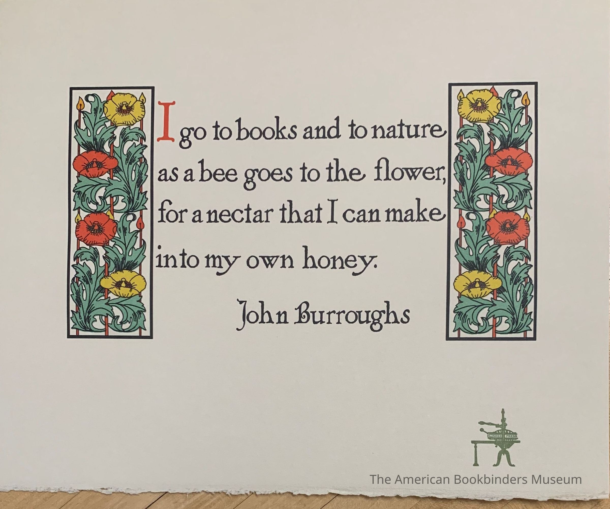 Quote printed in black on tan paper with colored sidebars of blossoms and leaves. Deckled bottom edge.Collection