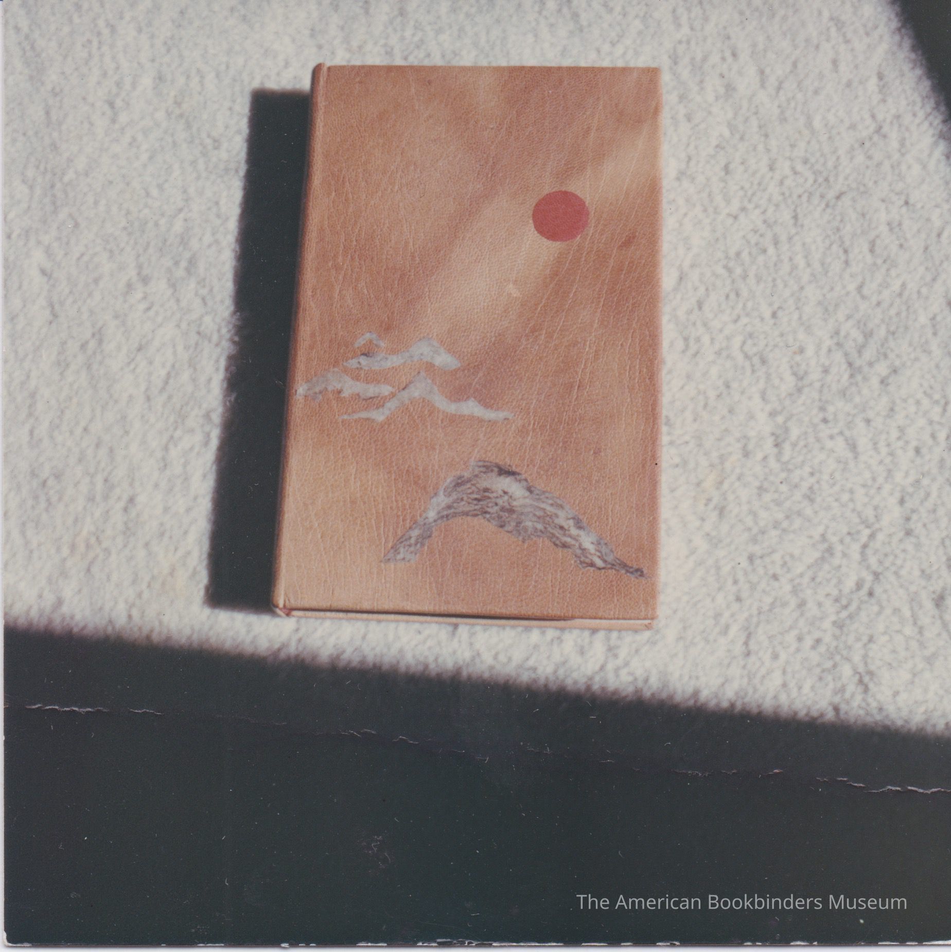 Photo of a book laying flat. The cover has a red circle in the top right, with two gray designs in the bottom third. Together these appear to be a landscape scene.Collection