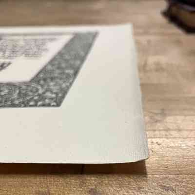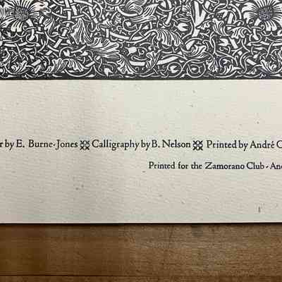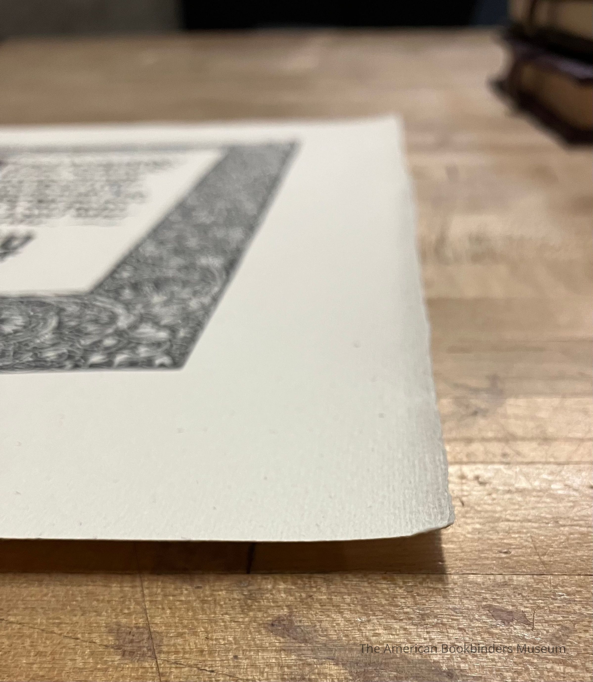A thick border of swirling vines, leaves, and flowers. Drop cap letter in red, and the design around it of vines in black. Middle of the frame has the quote, and author's name below. Paper has brown speckles from the recycled material. Right edge is raw.Collection
