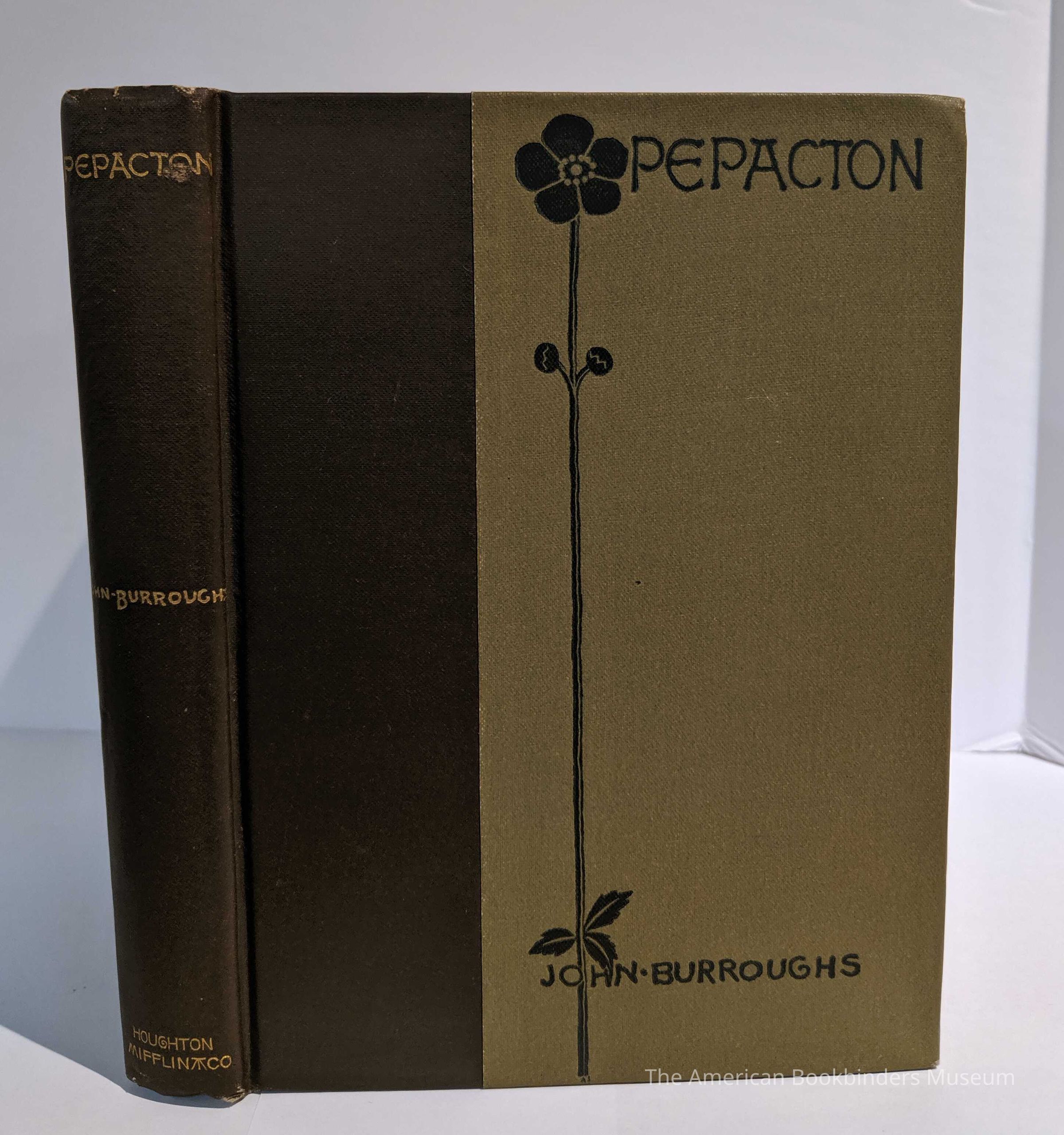 Bound in a three-pice binding of a wide smooth grain deep olive/brown cloth to the spine, which extends into a third of the cover space, where it is joined by a lighter olive colored cloth. A dark green vertical long-stemmed art nouveau flower (poppy?) is stamped next to the cloth join, from the bottom where the stem bisects the author's name, to the top where it just hits the title. Spine title and author stamped in gilt. Top edge gilt. Lettering in Whitman's signature typography. The effect is one of elegant monochrome simplicity. This is a uniform Whitman binding for a series of Burroughs titles issued by HM in the late 1890s, with the only variation being the blossom design. Unsigned.
