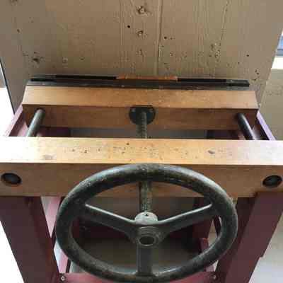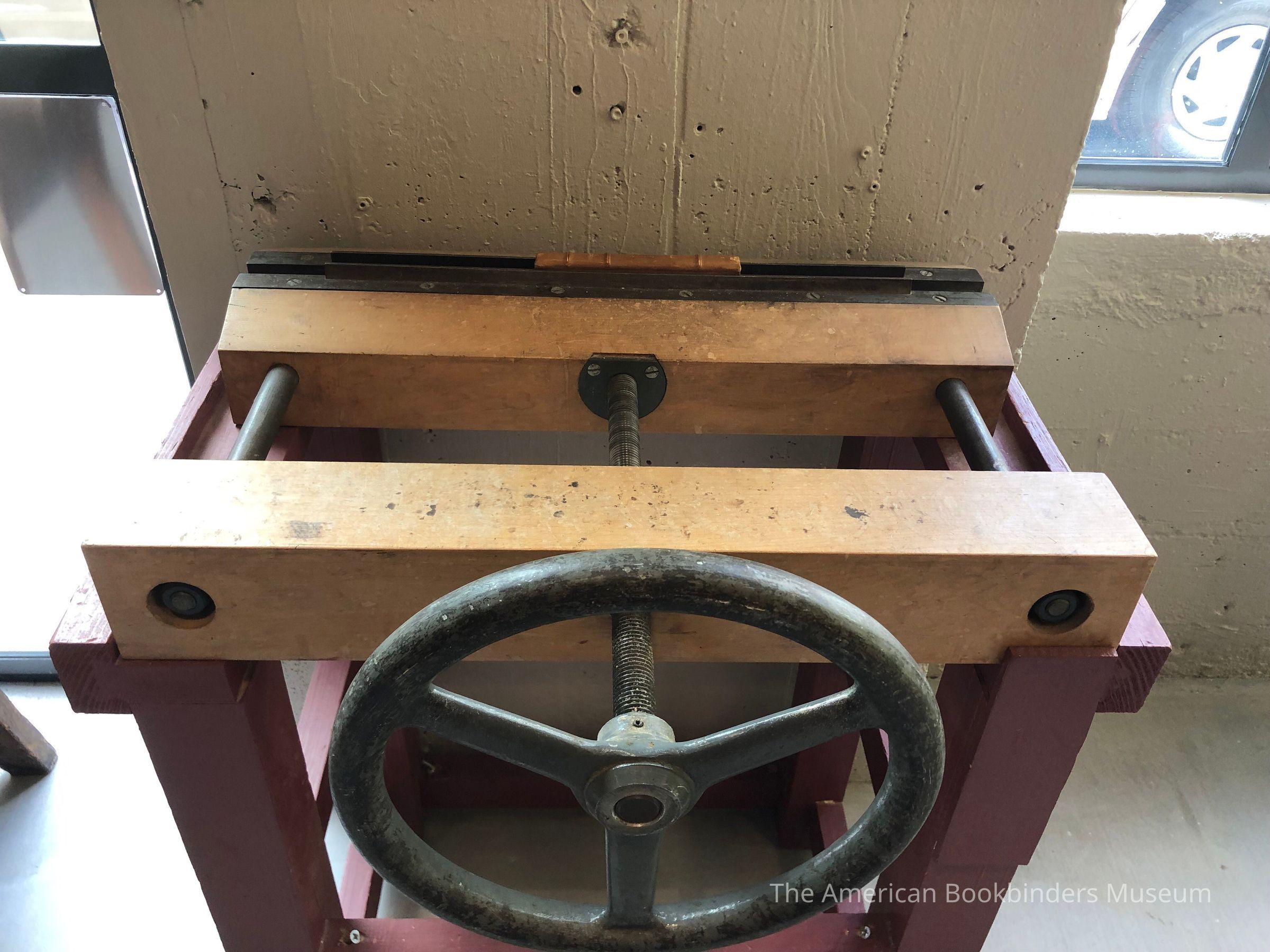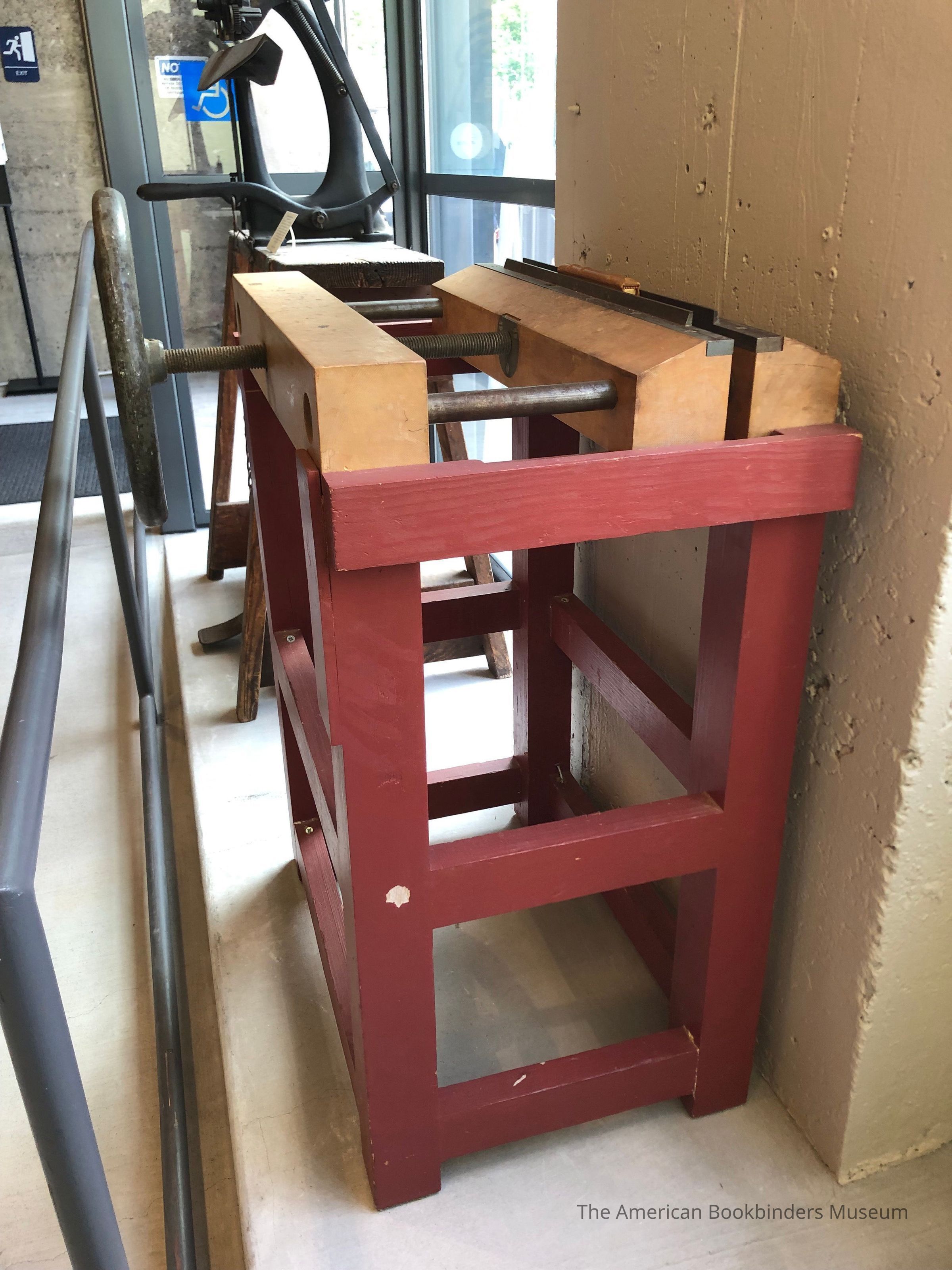 A finishing press on a red wooden stand. The clamping mechanism is a screw attached to a hand crank. A book is displayed in the jaws, spine side up.Materials