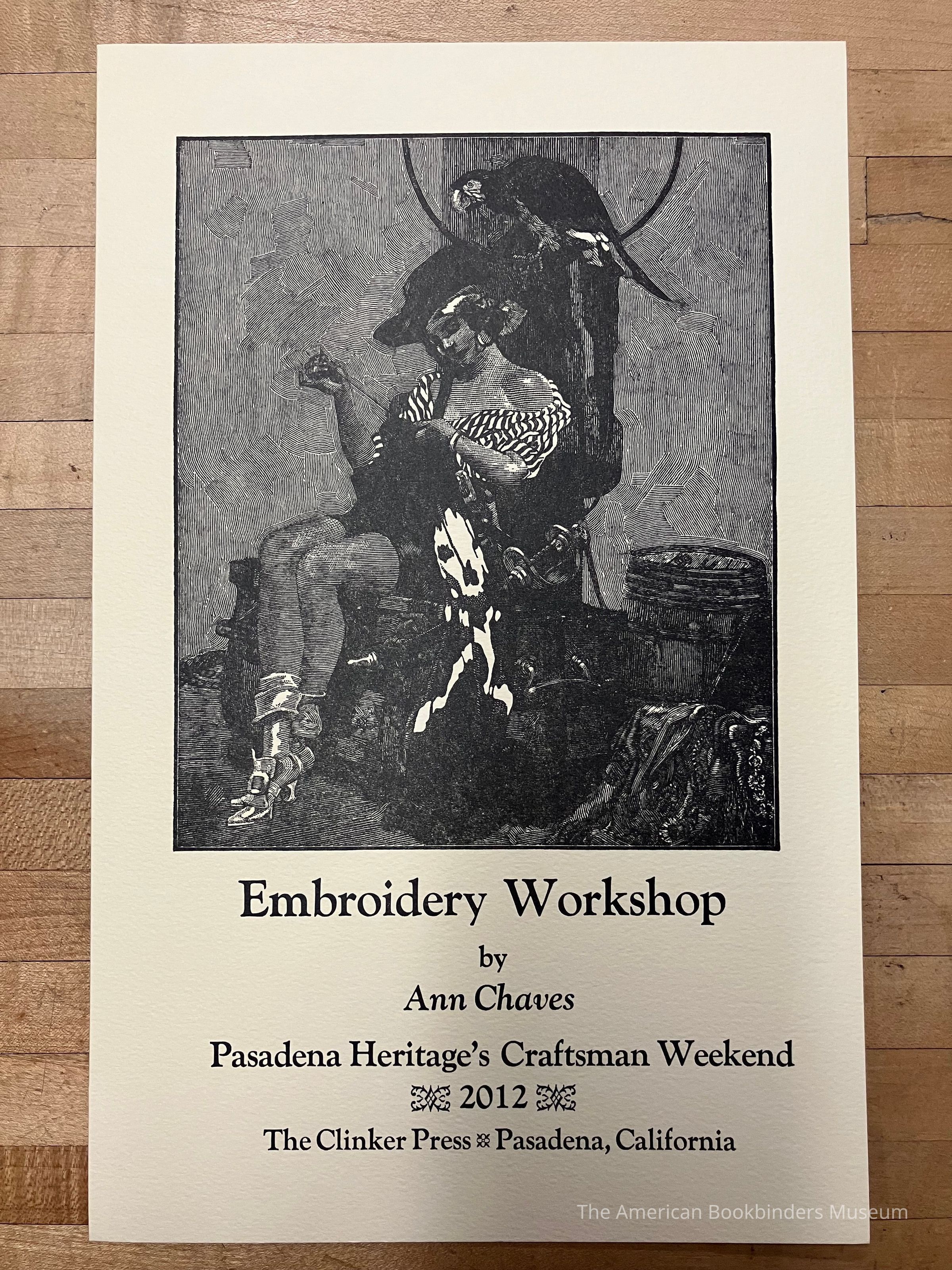 Cream paper. Etching fills most of the space, showing a woman sewing a pirate flag, surrounded by various objects. She wears a striped shirt, heeled boots, and hat. Text below for an embroidery workshop.Collection