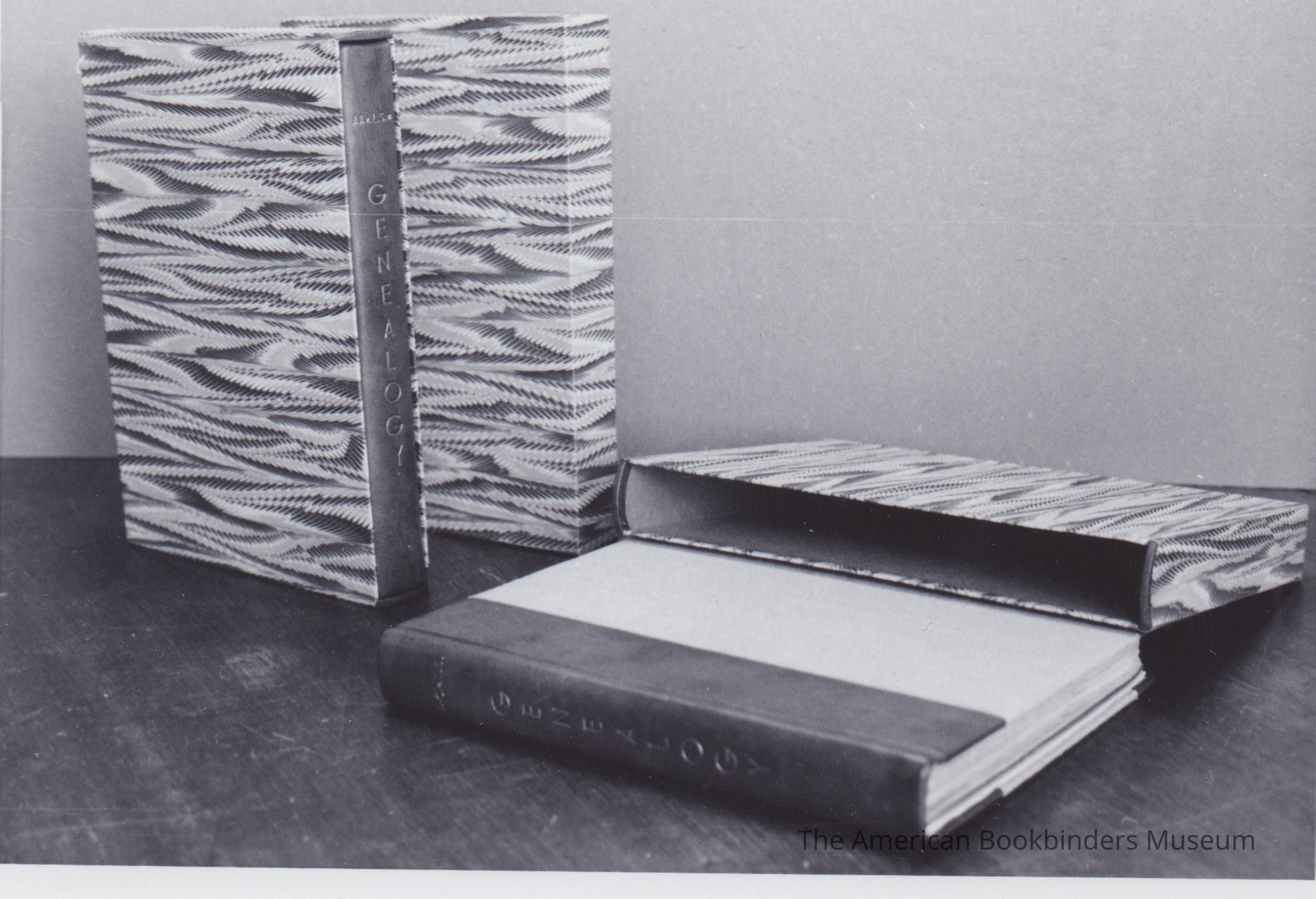 Two books with their cases. One is lying on the table outside of its case, the other is vertical inside its case. Both have 'Genealogy' down the spine.Collection