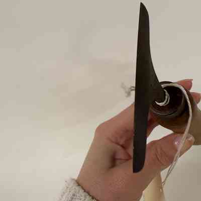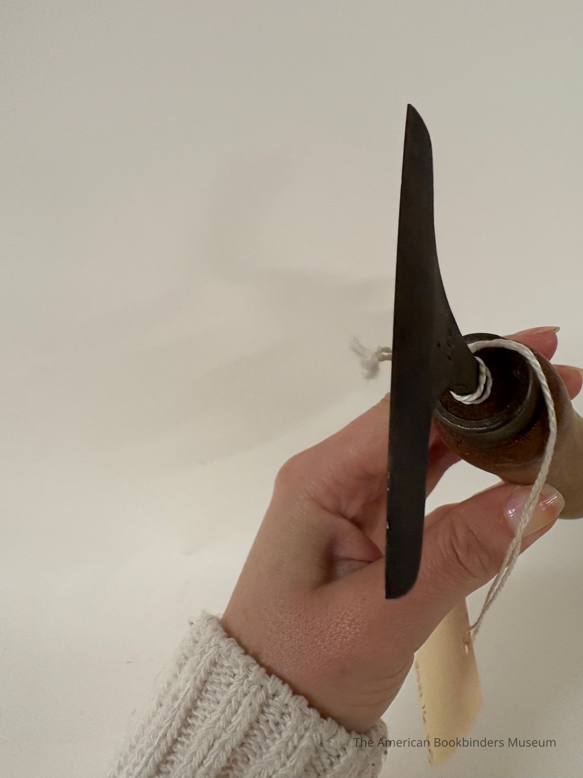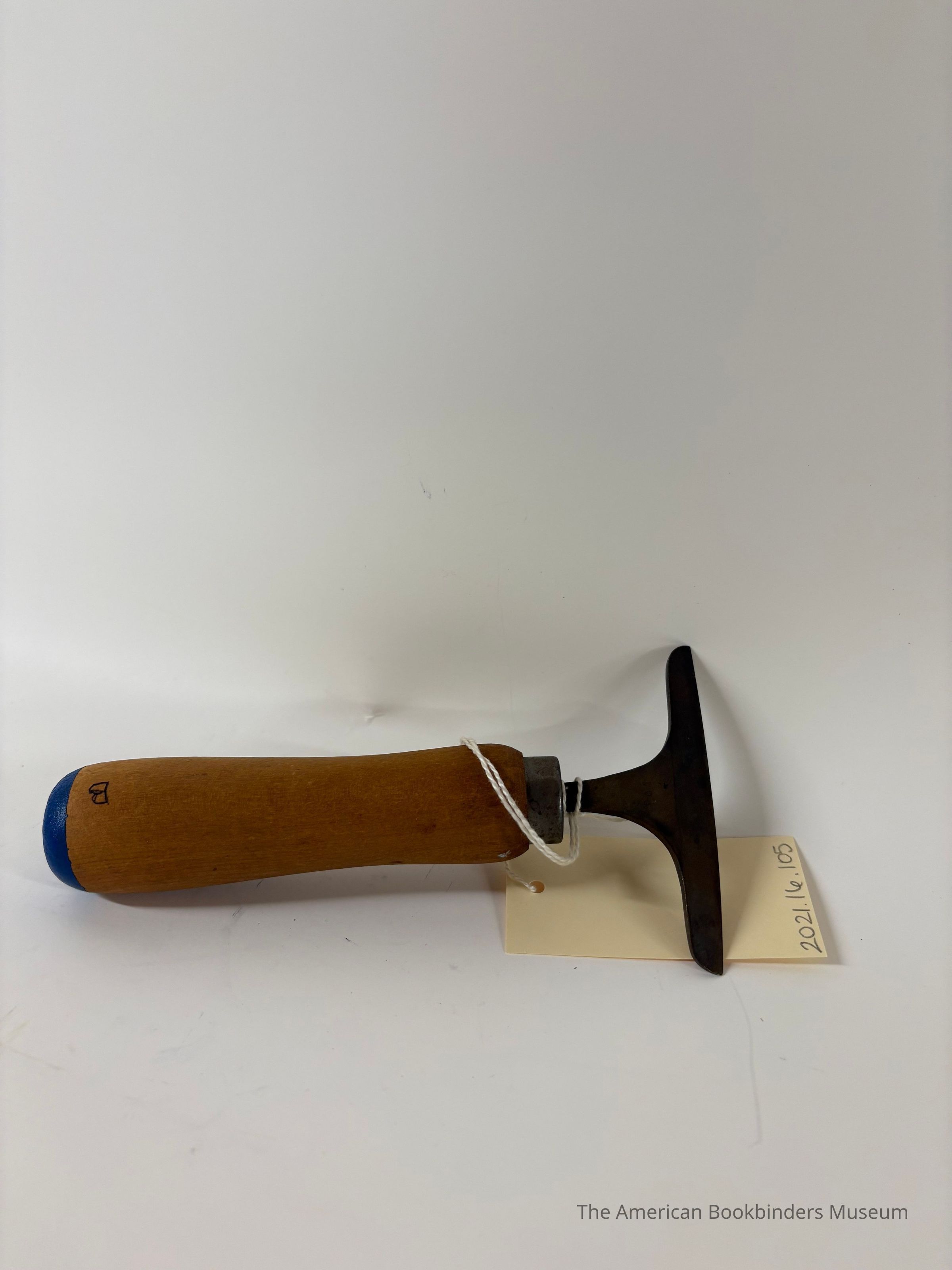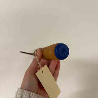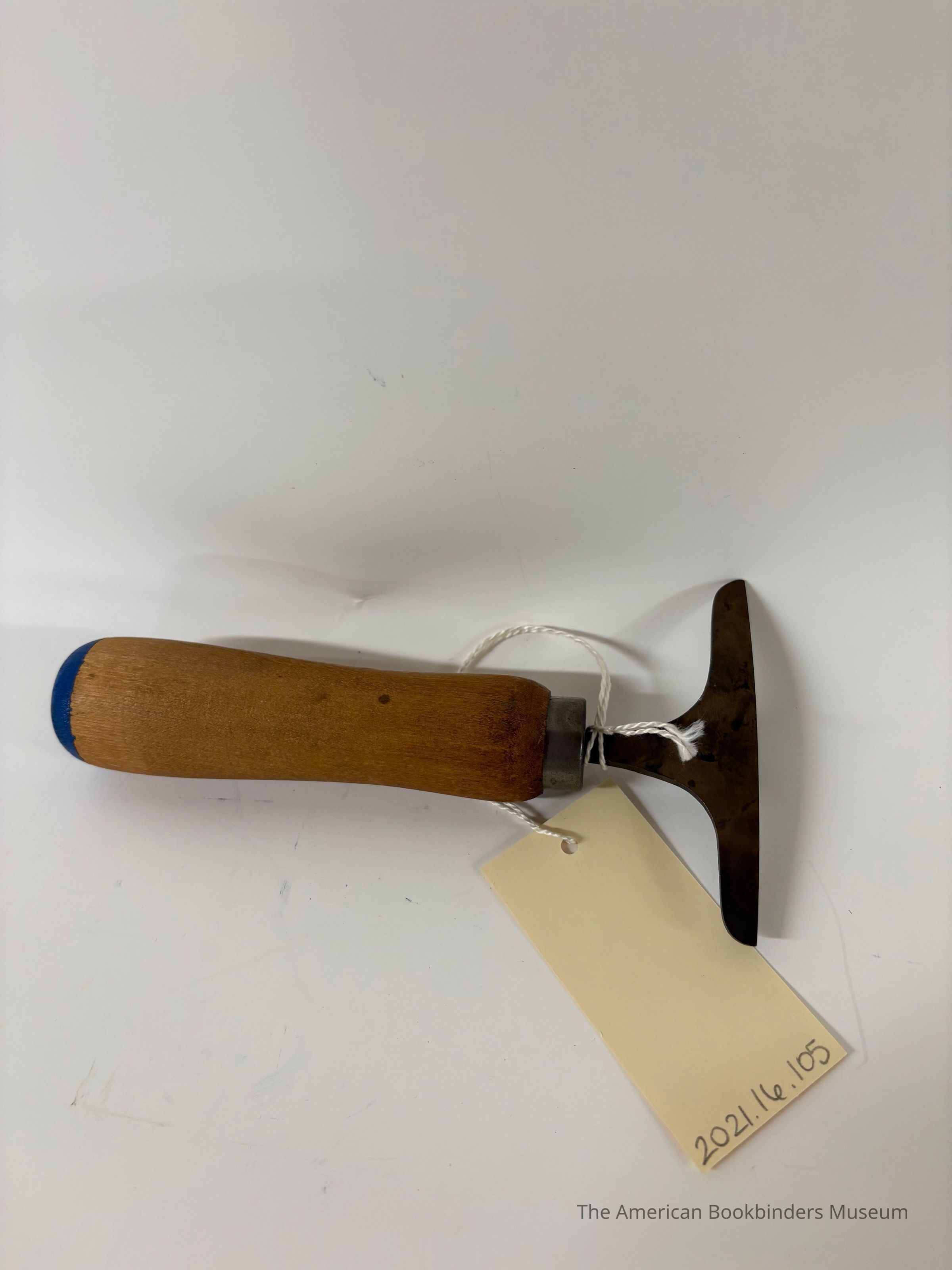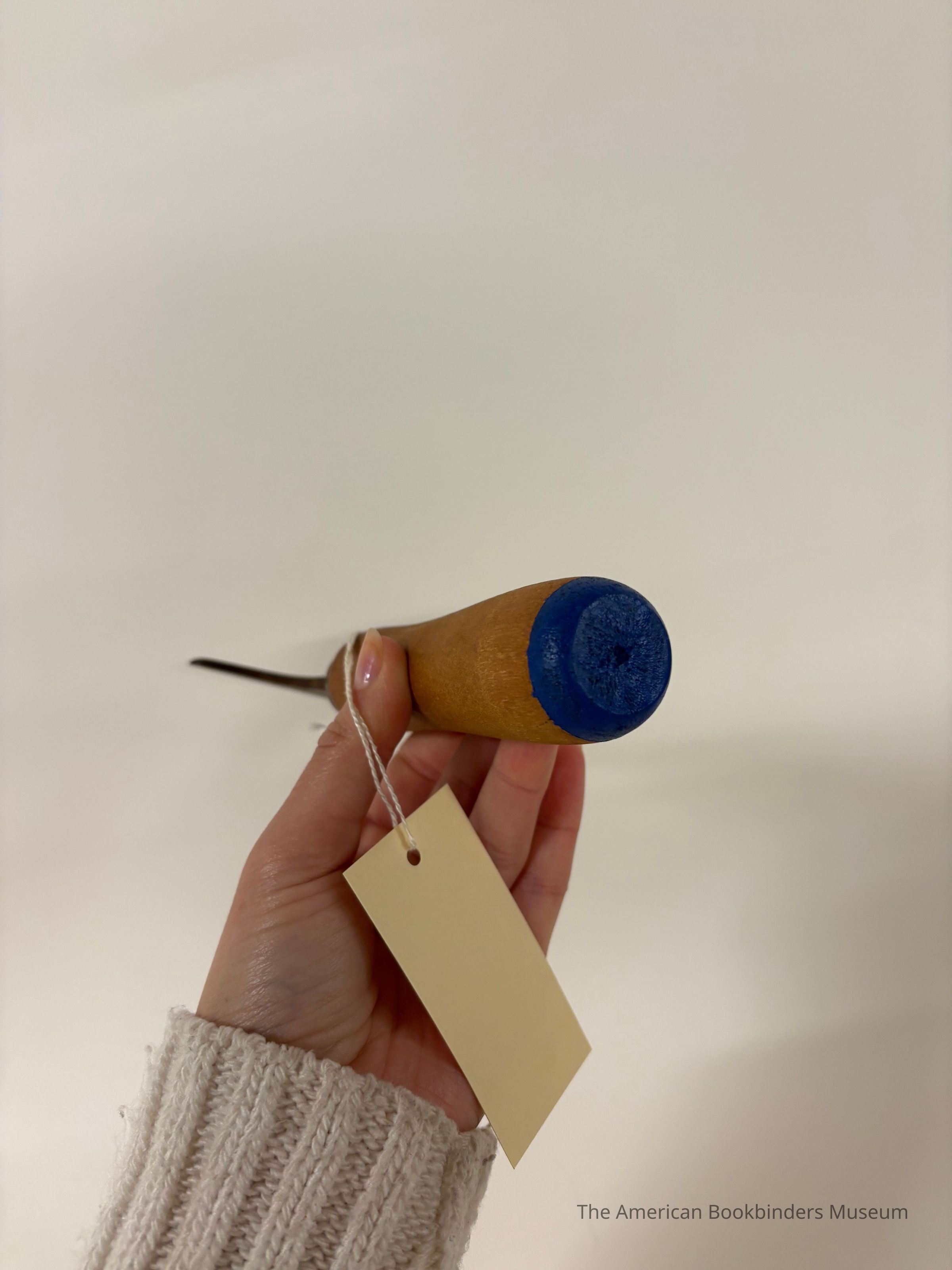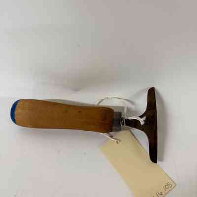 Single lined pallet fillet with a wood handle. The end of the handle is painted blue.