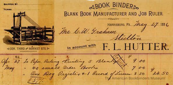 * Frank L. Hutter was born Harrisburg to Frank L. Hutter (also a bookbinder). Learn the trade from his father and would, upon his father's death, succeed him. J. M. Runk & Co Biographical Encyclopedia of Daupin County, pg. 574.