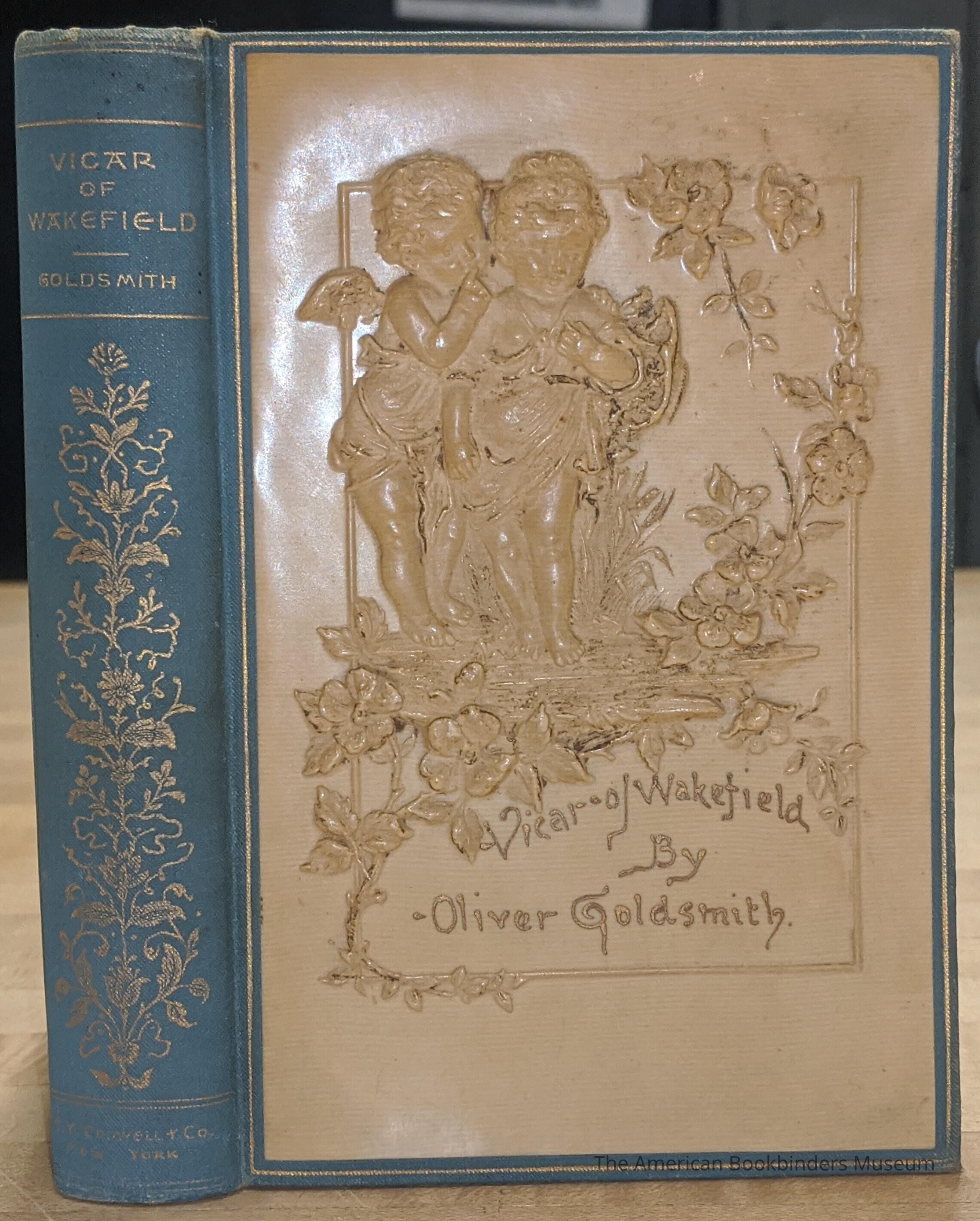 Bound in light blue diagonally ribbed cloth with ivorine cover carved in relief. The cover depicts two cherubs standing in a garden and a vine of flowers climbs the border. Title and decoration in gilt to spine. Plain endpapers, made endbands in cream cloth. All edges gilt.Notes