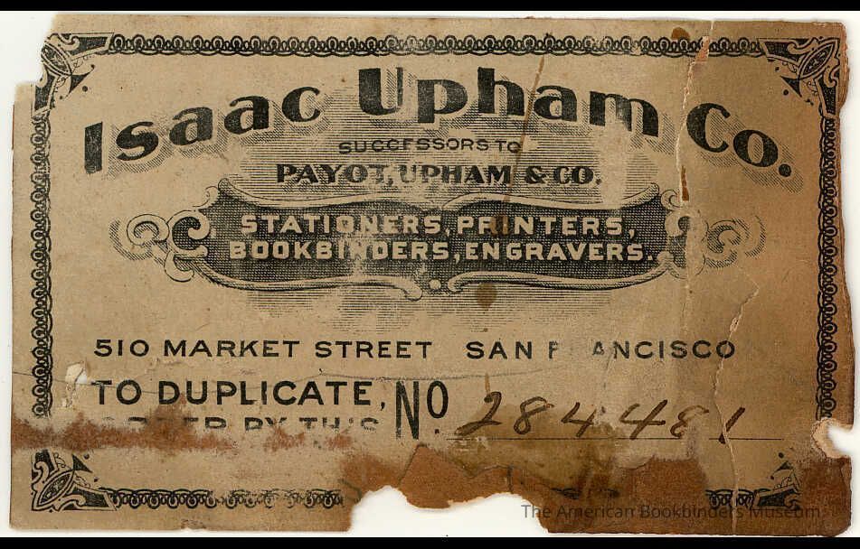 1. "Successors to Payot-Upham Co." probably due to the 1906 fire, (see Payot-