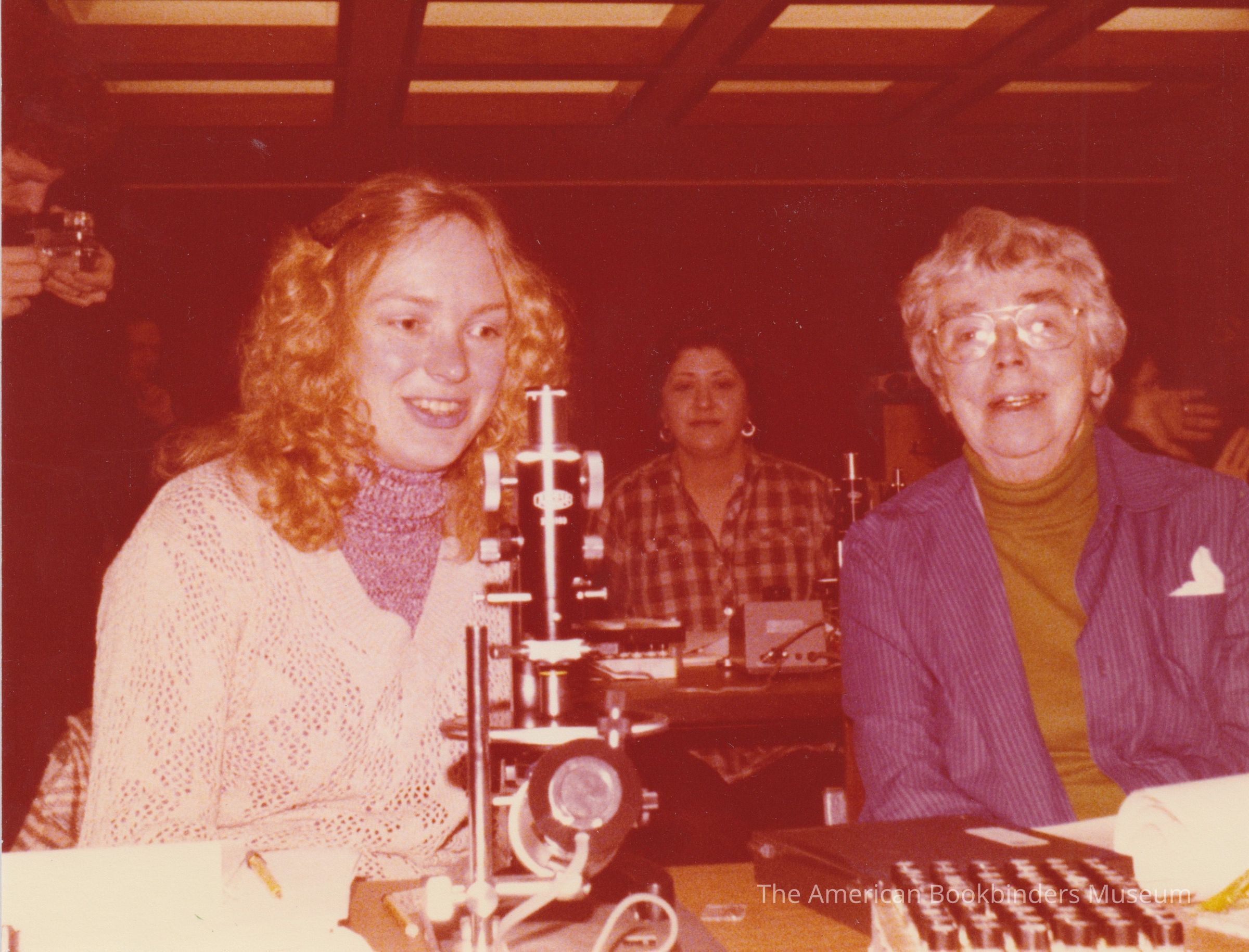 Photo of Stella Patri and a young woman, with the latter at a microscope. A figure with a camera is visible to the far left, and another woman is in the background.Photograph Details